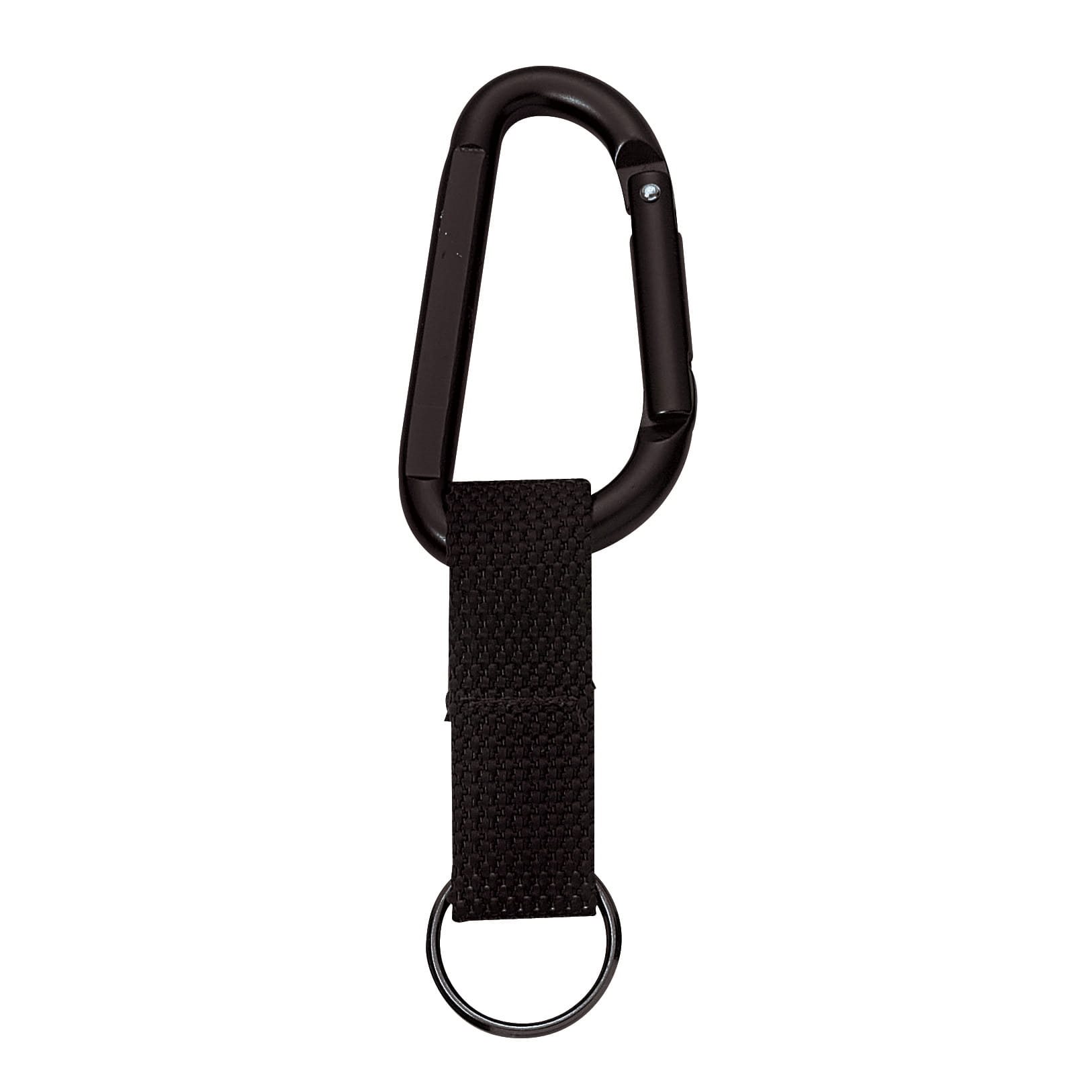 Mousqueton en aluminium pour fixer des accessoires, comprenant une sangle avec anneau. Le mousqueton n'est pas destiné à la sécurité personnelle. Plus d'informations