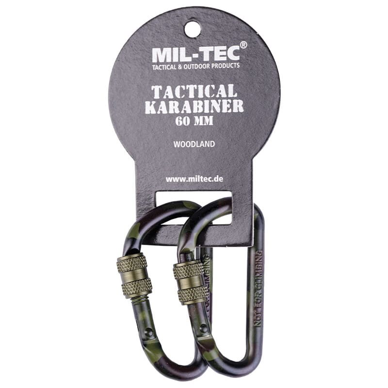 Mousqueton tactique camouflage woodland. Diamètre : 6 mm. Matériau : alliage d'aluminium solide. Une paire est comprise dans le prix. Ce produit n'est pas destiné à l'escalade, mais sert uniquement de mousqueton auxiliaire pour l'équipement. Plus d'informations
