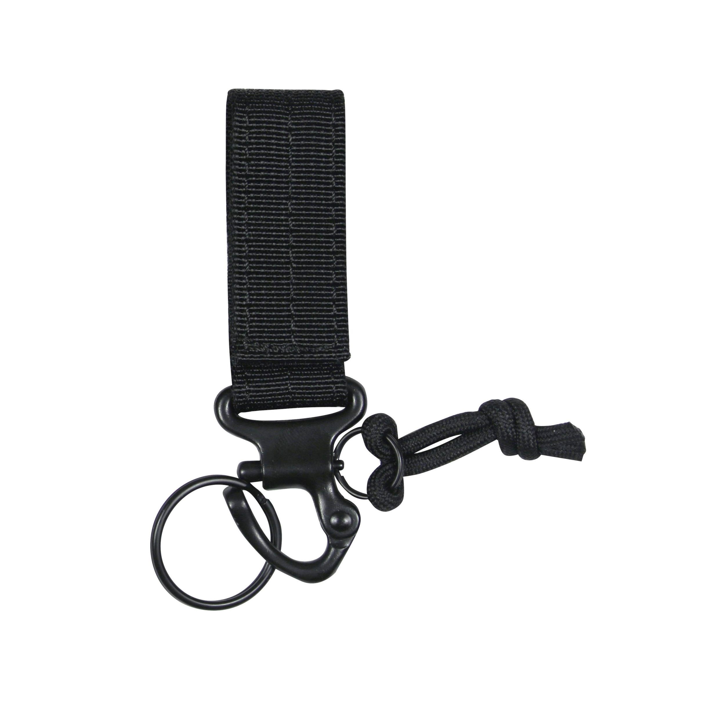 Mousqueton métallique avec sécurité, qui permet une ouverture facile et rapide par simple traction. Pour fixation à MOLLE. Livré avec anneau.