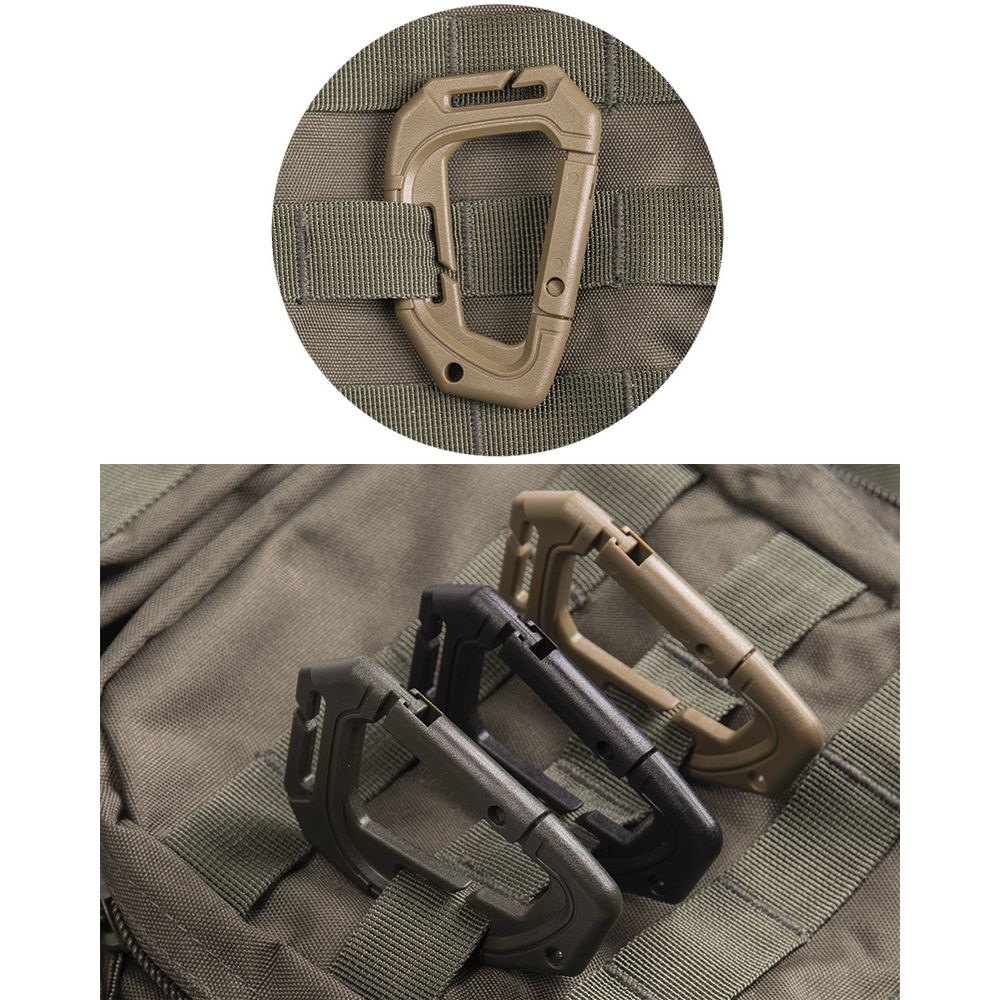 Nouveau modèle de mousqueton tactique MOLLE en plastique polyoxyméthylène. Dimensions : 9,3 cm, poids : 24 g. Lot de 2 pièces.
