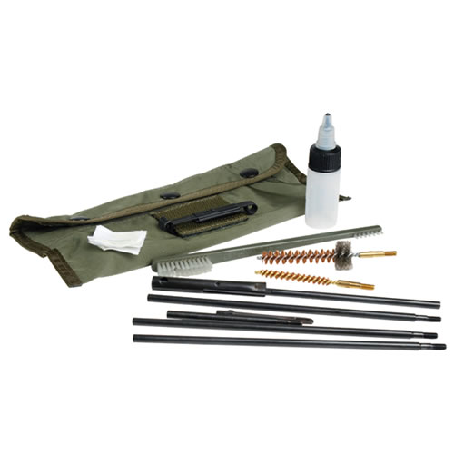 Kit de nettoyage pour armes KAL.5,56 M16/FAMAS/G36 utilisées par l'armée américaine. Il comprend une tige vissable en 6 parties d'une longueur maximale de 801 cm, 2 brosses de nettoyage (pour le canon et la chambre à cartouches), une brosse universelle en plastique et un récipient en plastique pour l'huile. Le tout est rangé de manière pratique dans un étui en polyester avec fermeture à 3 boutons-pression et clip pour fixation à la ceinture/au sac à dos...