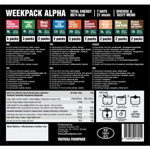 Des aliments lyophilisés, très légers, riches en énergie et équilibrés sur le plan nutritionnel. Contrairement aux aliments lyophilisés courants disponibles sur le marché, les repas de la marque TACTICAL FOODPACK sont approuvés pour une utilisation par les forces spéciales estoniennes et répondent également aux exigences d'autres forces spéciales des pays de l'OTAN. Le paquet contient un total de 21 portions et 9 variantes de repas qui vous permettront de rester en forme toute la semaine. Chaque repas est d'abord cuisiné dans son ensemble, sans additifs chimiques, puis lyophilisé et placé dans un emballage refermable. Cet ensemble de repas est un choix idéal pour les alpinistes, les randonneurs et les militaires, mais les survivalistes peuvent également l'apprécier grâce à sa longue durée de conservation.