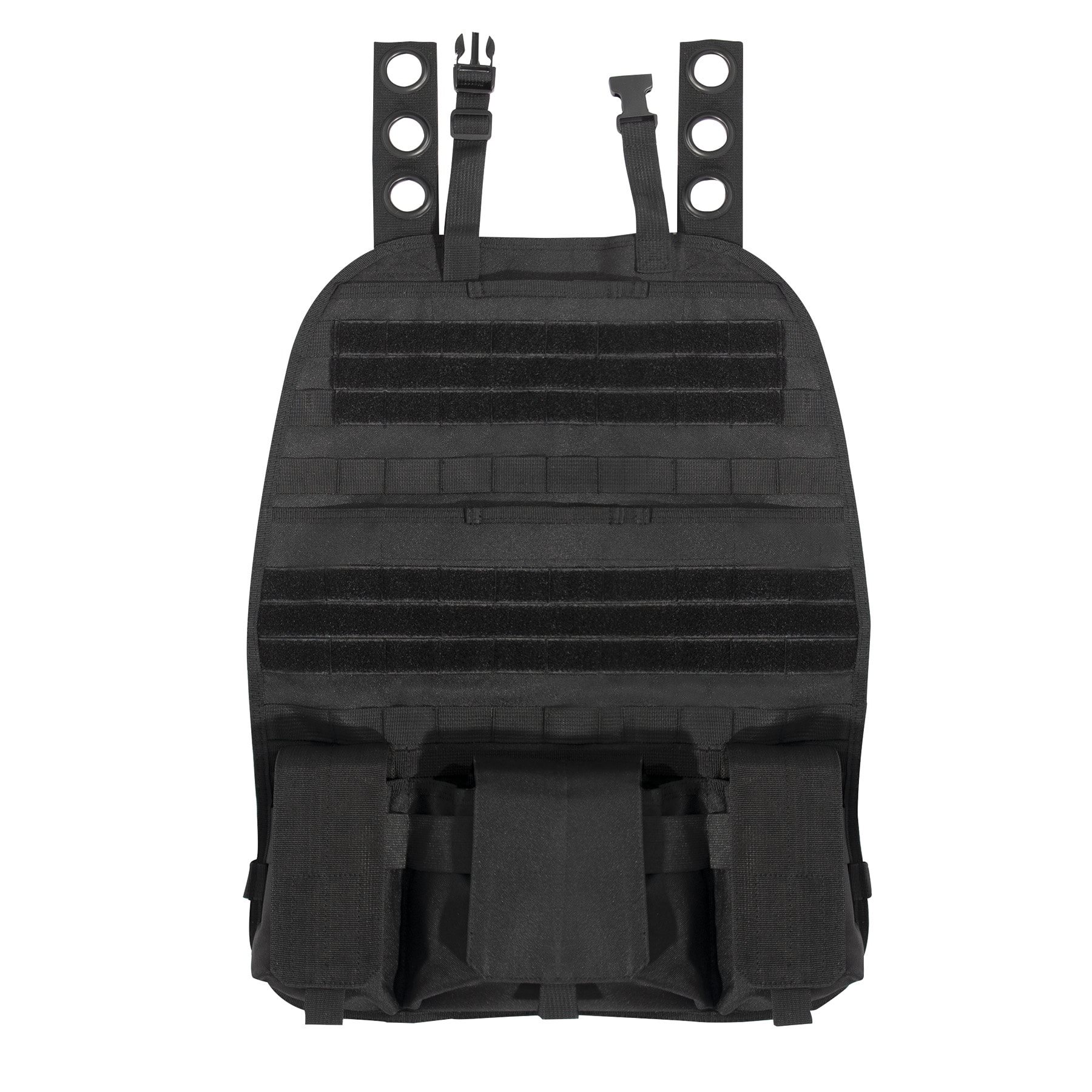 Sur la face avant du panneau, vous trouverez six rangées de sangles modulaires standard MOLLE/PALS, qui sont également équipées de velcro pour les écussons ou les inserts VELCRO. Deux poches plates se ferment à l'aide de velcro et sont idéales pour ranger des documents. Dans la partie inférieure, vous trouverez trois poches universelles avec des rabats à velcro.