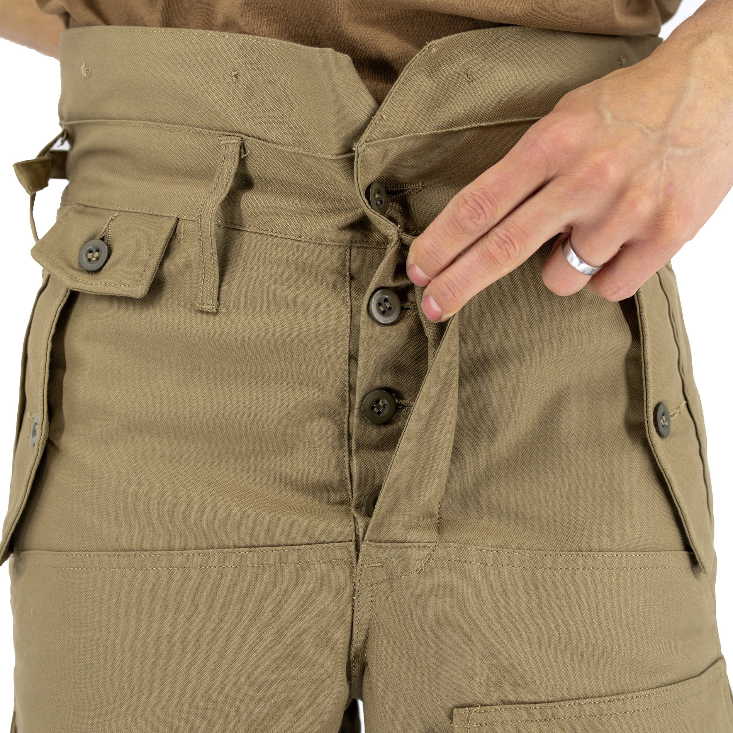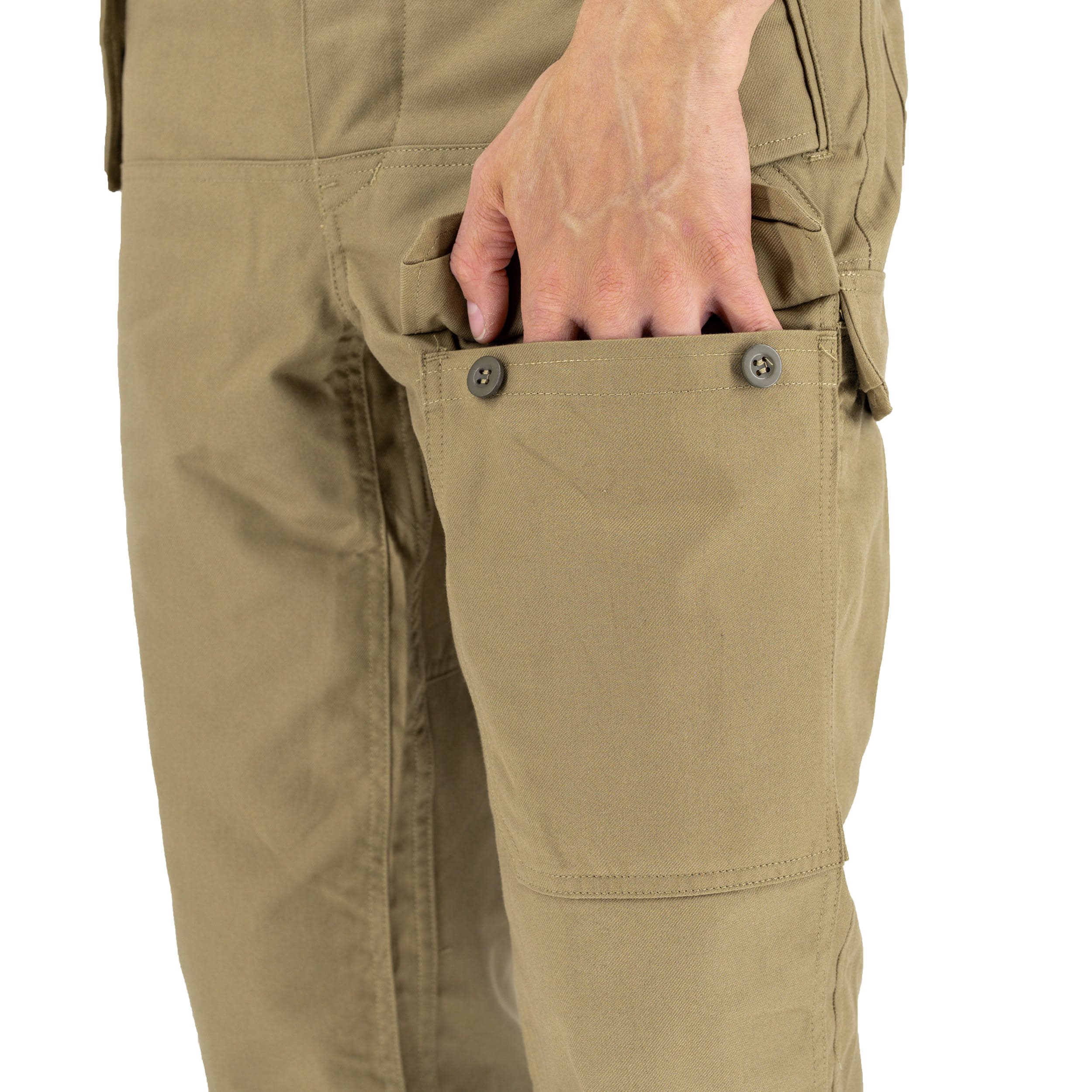 Les pantalons sont très résistants, pratiques et confortables, conçus pour être portés toute l'année et pour survivre dans des conditions naturelles difficiles. Ils disposent de plusieurs grandes poches et sont renforcés aux endroits les plus sollicités, à savoir les genoux et l'assise. Des bandes avec boucles sont cousues à la taille pour permettre un ajustement éventuel - la taille peut être réduite jusqu'à 4 cm de chaque côté. Il est également possible d'augmenter la taille à volonté en détachant les boutons sur le pourtour. La longueur des jambes est suffisante et peut être ajustée à l'aide d'élastiques. Une pièce avec un bouton de rechange est incluse dans la poche.