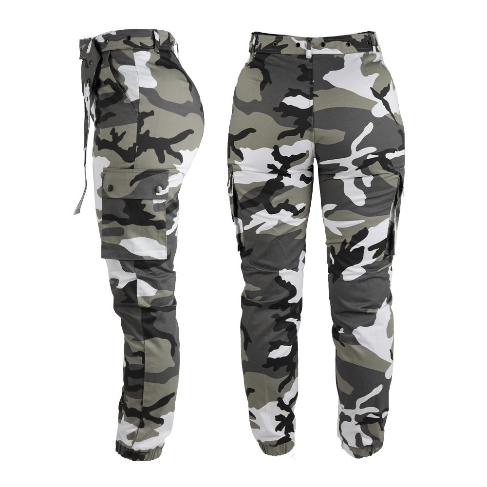 Pantalon militaire élégant pour femmes, à taille haute. Il comporte quatre poches pour ranger vos effets personnels. Deux poches classiques à l'avant avec une ouverture en biais et deux poches cargo sur les cuisses, fermées par un rabat à boutons-pression. Les jambes du pantalon sont terminées par un ourlet élastique. Une ceinture est fournie avec le pantalon.