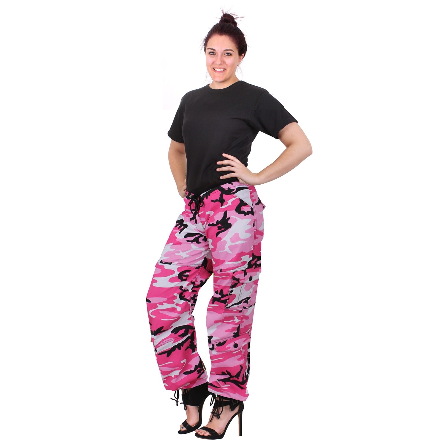Pantalon camouflage confortable et tendance de type paratrooper, modèle femme. Plus d'informations