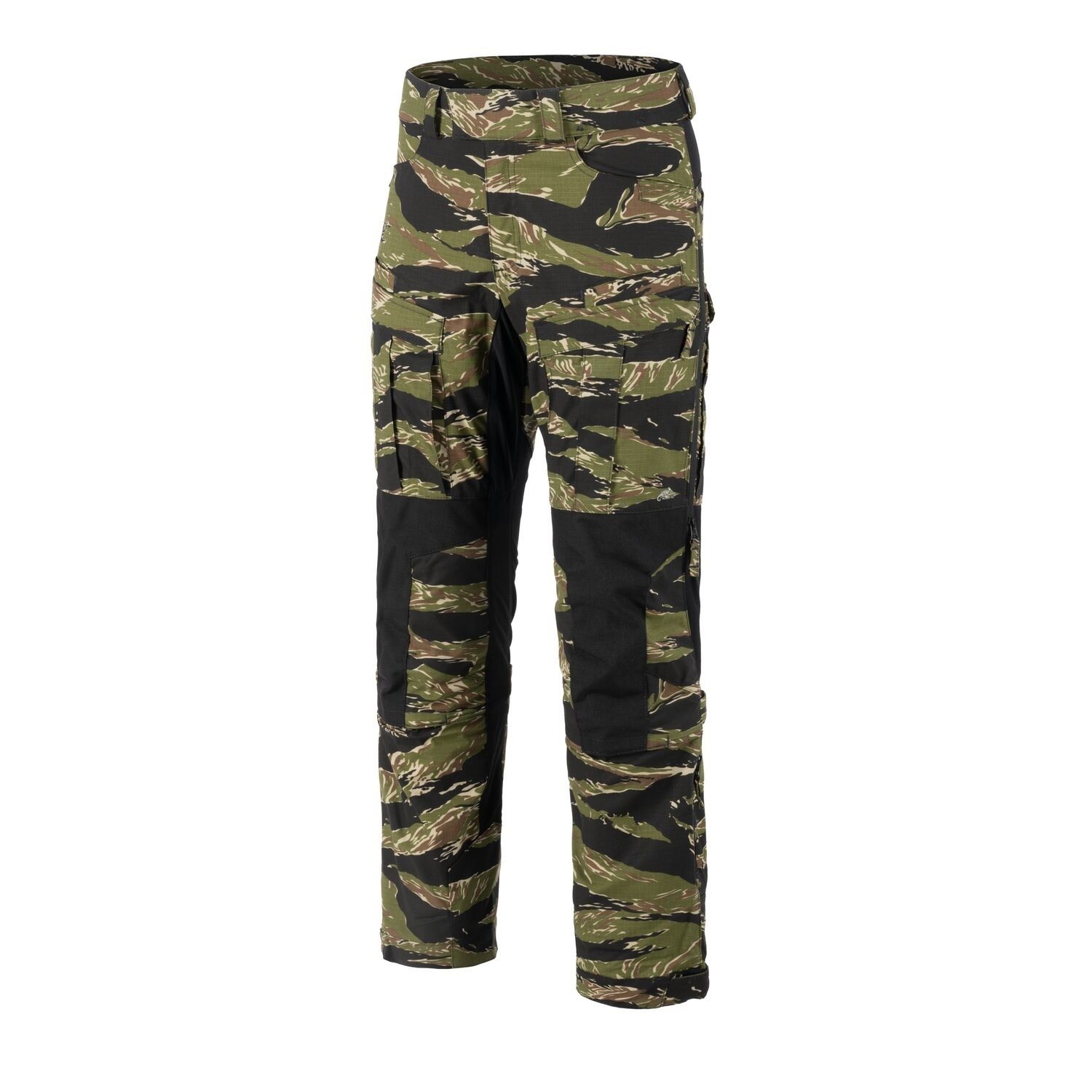 La fermeture du pantalon est assurée par une combinaison de velcro et de fermeture éclair métallique classique. Les passants à la taille sont suffisamment larges pour accueillir des ceintures jusqu'à 40 mm de large. Les poches pour les mains sont relativement spacieuses et disposent de bords renforcés qui empêchent tout dommage lors du port de couteaux dans la poche. Les poches avant sur les cuisses sont doubles. La paire « arrière » est idéale pour transporter des chargeurs de pistolet ou d'autres petits objets similaires. La paire « avant » de poches cargo est accessible par une fermeture éclair recouverte d'un rabat et offre un grand espace de rangement. La deuxième paire de poches cargo se trouve à l'arrière des cuisses. L'espace entre les poches est occupé par une fermeture éclair qui, une fois ouverte, révèle un filet destiné à évacuer l'excès de chaleur. Les poches arrière peuvent facilement contenir un portefeuille, mais ne disposent d'aucune fermeture de sécurité. La dernière paire de poches se trouve sur les mollets et se ferme à l'aide d'une fermeture éclair verticale.