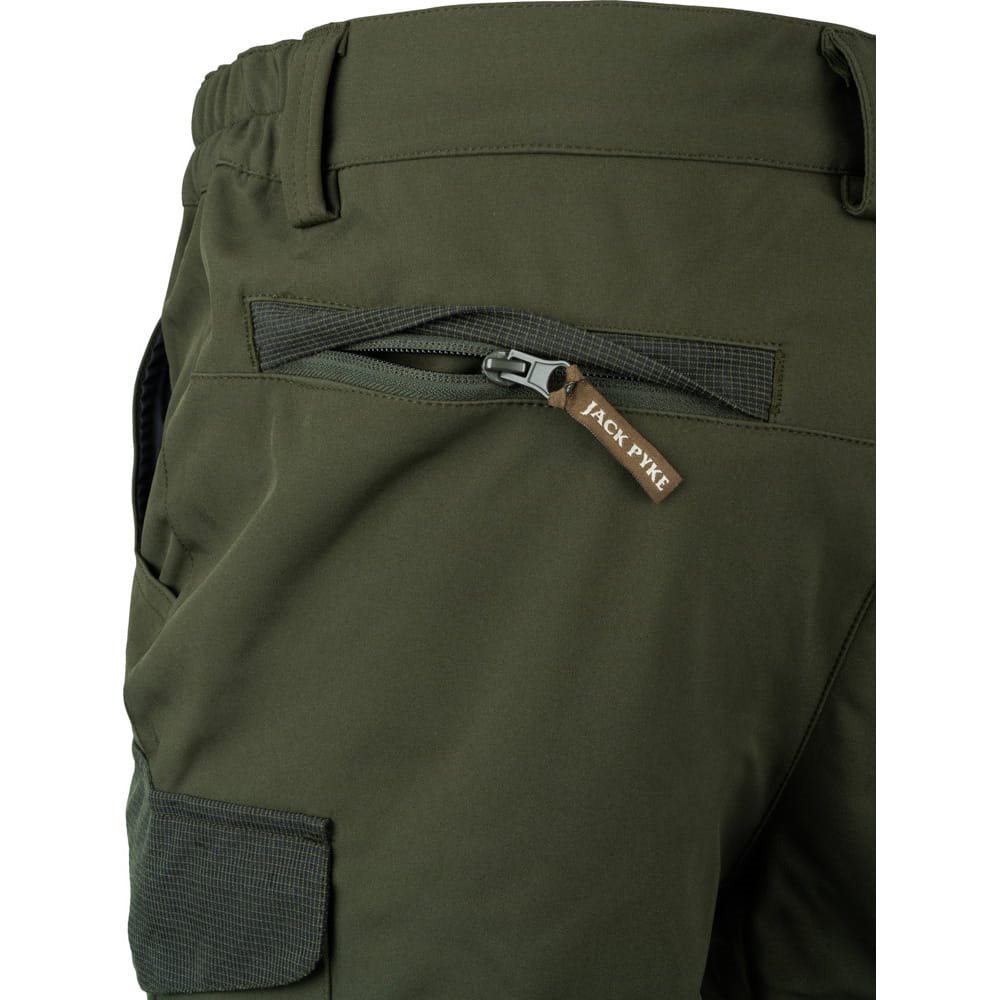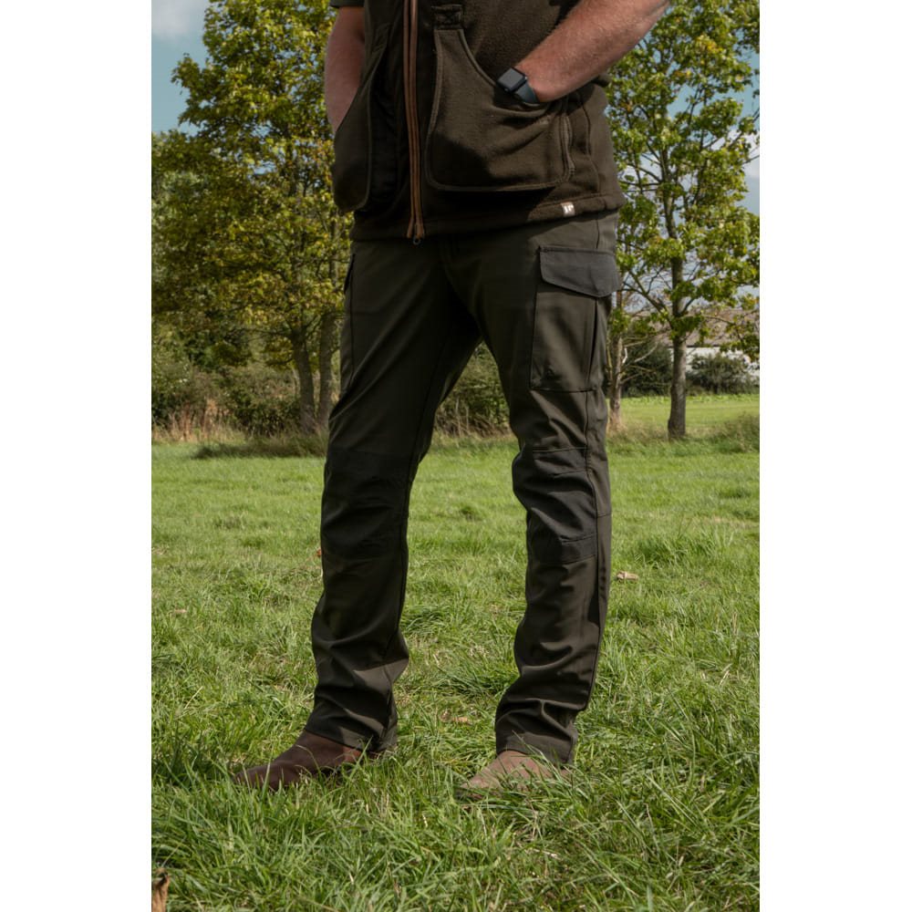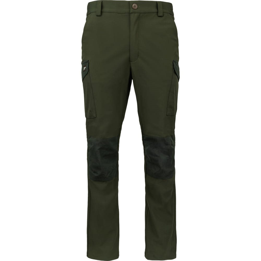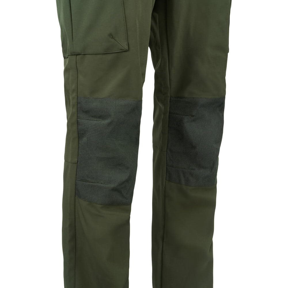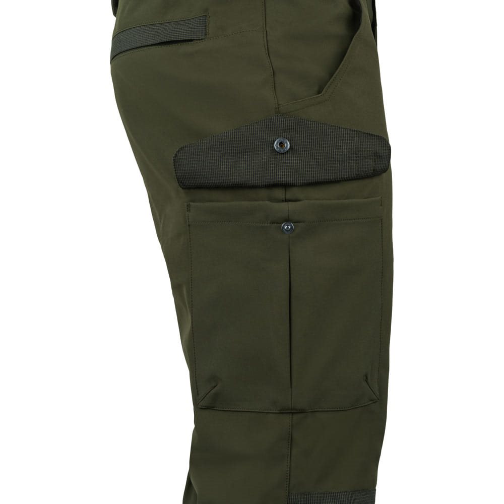 La fermeture des pantalons est assurée par une combinaison de boutons-pression métalliques et d'une fermeture éclair classique. Les passants de ceinture sont larges. Les poches pour les mains ont des bords renforcés et sont suffisamment spacieuses pour ranger les petits accessoires dont vous avez besoin à portée de main. Les deux poches cargo latérales sont accessibles par un rabat à boutons-pression métalliques. Les poches arrière sont recouvertes d'une patte et peuvent être fermées à l'aide d'une fermeture éclair avec tirette si nécessaire. Les genoux du pantalon sont de couleur verte contrastante.