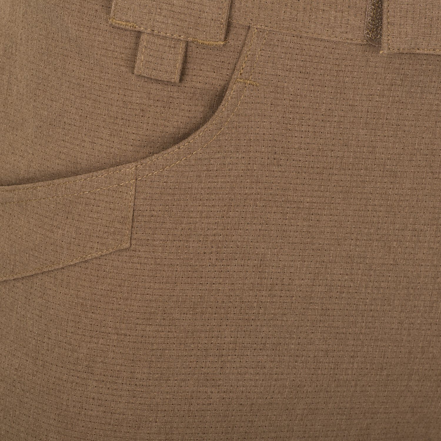 Le pantalon se ferme à l'aide d'une combinaison de fermeture éclair sèche et classique. La taille est élastique, surélevée et comporte cinq œillets pour passer des ceintures d'une largeur maximale de 50 mm. La paire d'œillets avant est également dotée de petites boucles qui peuvent servir à accrocher des anneaux en D ou des mousquetons avec du matériel. Sous les œillets avant, vous trouverez des poches avant en biais. Elles sont suffisamment spacieuses et dotées de bords renforcés adaptés à la suspension de couteaux ou d'autres équipements. À l'arrière, vous trouverez quatre poches. Deux poches classiques en biais et deux poches droites, idéales pour ranger des smartphones ou des équipements similaires. Les genoux du pantalon sont renforcés par une double couche de tissu et sont équipés d'une poche pour les genouillères. L'accès aux poches pour les genouillères se fait de l'intérieur, par une ouverture à velcro. Le bas des jambes est équipé de tunnels dans lesquels il est possible de passer des cordons si nécessaire.
