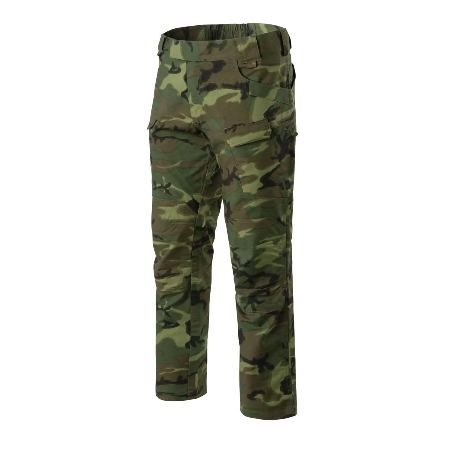 La fermeture du pantalon est assurée par une combinaison de fermeture éclair métallique et de velcro, avec possibilité d'ajuster la largeur de la taille d'environ 6 cm. À la taille, vous trouverez de larges passants pour des ceintures d'une largeur maximale de 50 mm, avec la possibilité d'accrocher des mousquetons à l'avant. Les poches pour les mains ont des ouvertures assez larges et leurs bords sont renforcés pour pouvoir transporter des couteaux ou des outils multifonctions sans risque d'endommager le tissu. Les cuisses sont équipées de quatre poches. Les deux poches plus étroites, fermées par un rabat à velcro, peuvent contenir par exemple un smartphone ou un chargeur AR/AK. Les deux larges poches cargo fermées par un zip permettent de transporter l'équipement que vous souhaitez avoir rapidement à portée de main. Les fesses disposent également de quatre poches, les plus étroites sont idéales pour les chargeurs de pistolet (ou tout autre équipement de taille similaire), les plus larges peuvent facilement contenir un portefeuille et comprennent également deux petits compartiments pour les pièces de monnaie, par exemple. Si nécessaire, les ourlets des jambes peuvent être équipés d'un cordon de serrage.