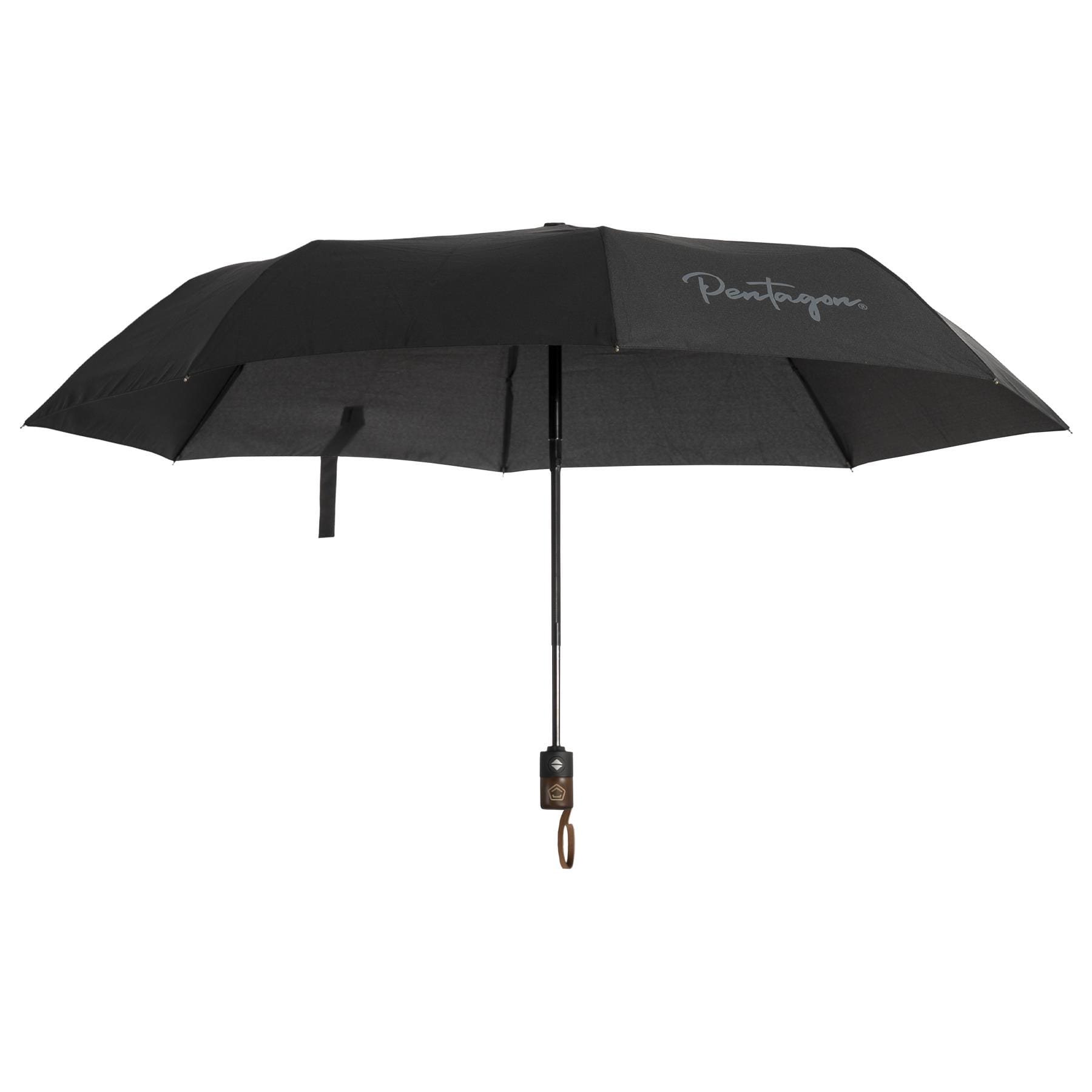 Parapluie à ouverture automatique avec revêtement en téflon. La toile est fabriquée en polyester résistant aux UV SPF80 et est renforcée afin de conserver sa forme et de résister à des vents violents. L'ouverture s'effectue à l'aide d'un bouton situé dans la poignée, qui est en partie fabriquée en bois et ornée du logo de la marque PENTAGON. Une fois plié, le parapluie ne mesure que 27,5 cm, ce qui lui permet de se glisser facilement dans la plupart des sacs à dos ou sacs. Il est bien entendu livré avec une housse de transport en tissu.