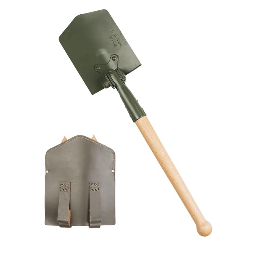 Pelle pliante militaire BW - prédécesseur de l'actuelle pelle en trois parties • très stable et facile à manipuler • avec manche en bois • avec étui en cuir pour ceinture • longueur repliée : 45 cm • poids : environ 1,5 kg