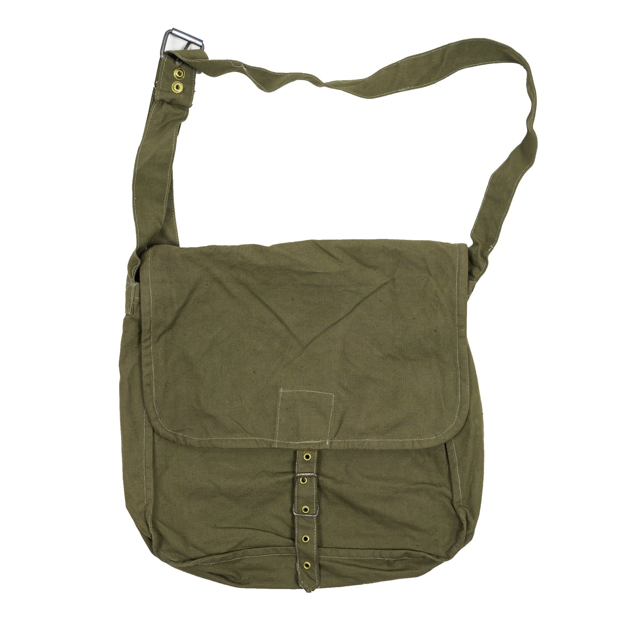 Sac à pain à bandoulière provenant des soldes de l'armée bulgare. Grande poche principale sans compartiments intérieurs. Dimensions : environ 30 x 27 x 6 cm.