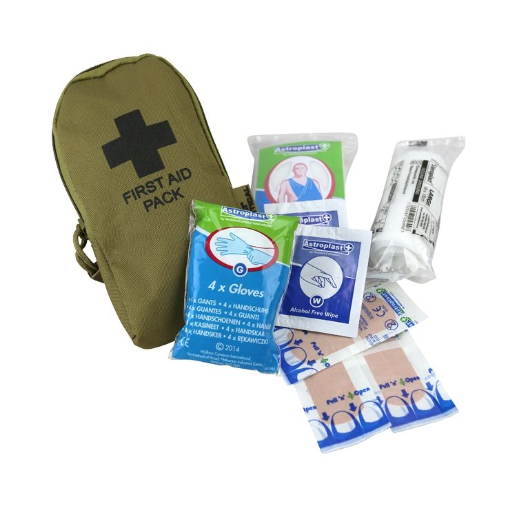 Petite trousse de premiers secours compacte avec imprimé camouflage BTP, très similaire au modèle britannique MTP. La trousse dispose de deux boucles élastiques à l'arrière pour la fixation sur un sac à dos, ou d'une boucle fixe pour la fixation à une ceinture, etc. La trousse de premiers secours contient :