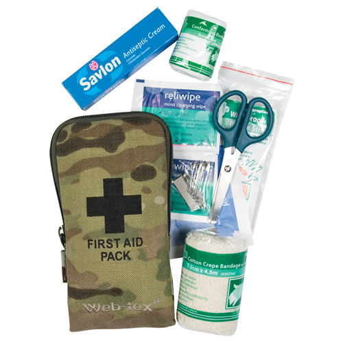 Petite trousse de secours compacte et personnelle avec imprimé camouflage. La trousse de secours est dotée à l'arrière de deux passants élastiques permettant de l'attacher à une ceinture, par exemple. Plus d'informations
