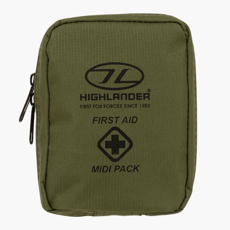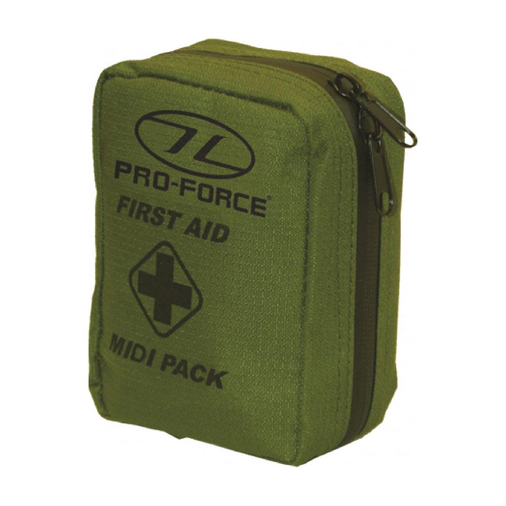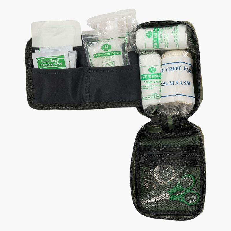 Trousse de premiers secours de taille moyenne rangée dans un étui résistant. Celui-ci est fabriqué dans un matériau ripstop solide et imperméable, son contenu est accessible grâce à une fermeture éclair métallique bidirectionnelle et étanche. À l'arrière de l'étui, vous trouverez une boucle de ceinture avec un bouton-pression métallique, qui est sécurisée par du velcro en cas de défaillance.