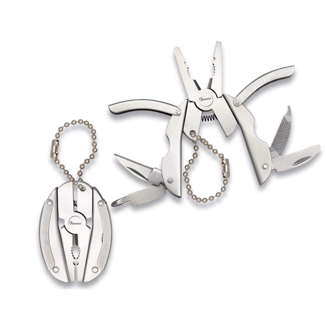 Petit outil multifonctionnel comprenant une pince, deux couteaux à lame lisse, une lime et un tournevis. Longueur totale (déplié) : 7,5 cm. Matériau : acier inoxydable 3Cr13MoV. Poids : 46 g. Plus d'informations