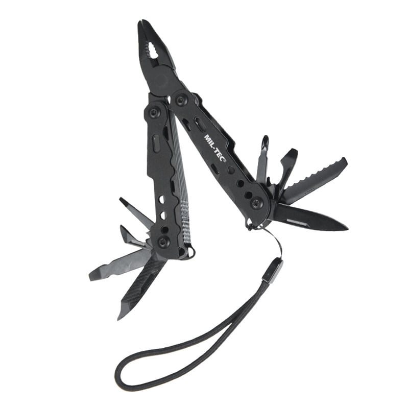 Au total, neuf outils peuvent être ouverts d'une seule main : une pince, une lime, deux tournevis plats, un tournevis Phillips, un ouvre-boîte, un décapsuleur, un couteau à lame lisse et une scie. L'outil est livré avec un étui en nylon noir à fixer à la ceinture.