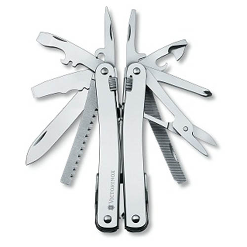 Outil multifonction de poche Victorinox présenté dans un étui en cuir brun. Nombre total de fonctions : 26.