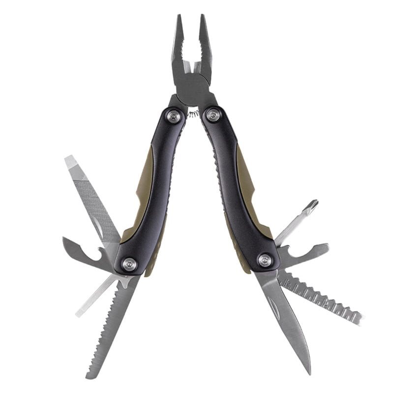 Outil multifonctionnel comprenant : une pince, un coupe-fil, un couteau à lame lisse, un tournevis plat et cruciforme, un ouvre-boîte et un décapsuleur, une règle, une scie et une lime. Plus d'informations