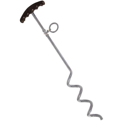 Piquet torsadé avec œillet. Grâce à son extrémité en spirale, le piquet s'enfonce facilement dans le sol et permet d'attacher la laisse du chien à l'œillet. Vous disposez ainsi d'un point d'ancrage solide pour attacher votre chien pratiquement partout où le piquet peut être enfoncé.