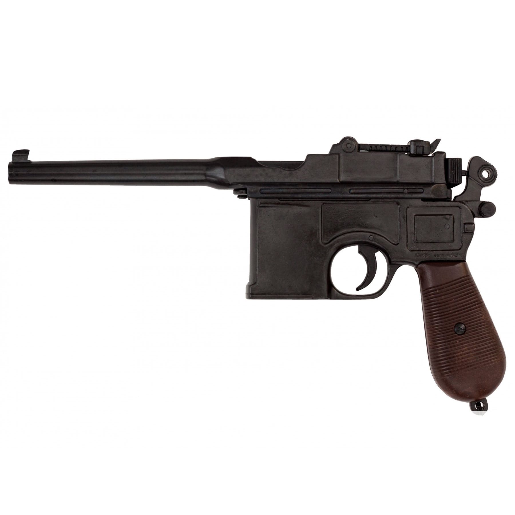 Réplique du pistolet Mauser 1898 noir. Pistolet semi-automatique à culasse verrouillée utilisé pendant la Seconde Guerre mondiale. Le pistolet peut être armé et émet un clic lorsque la détente est actionnée. Il s'agit d'une réplique décorative non fonctionnelle d'une arme réelle. Les plaquettes de crosse sont en plastique imitation bois. Poids : 1 120 g.