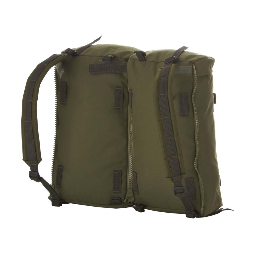Une poche peut être utilisée seule comme sac à dos compact (livrée avec des sangles rembourrées amovibles). En attachant deux poches ensemble, vous obtenez un sac à dos plus grand de 20 litres.