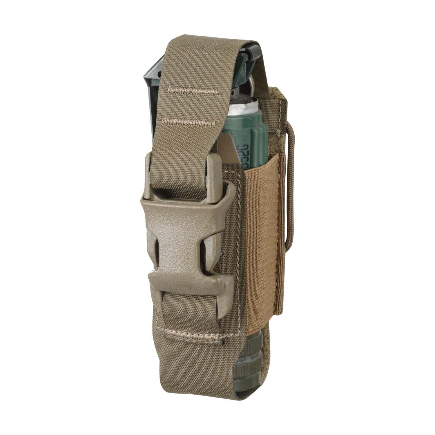 Pochette universelle conçue pour le rangement des grenades flash de type NIKO/P1. La pochette est fabriquée à partir d'un matériau laminé de haute qualité et est équipée d'une boucle amovible ITW QASM. Le rabat supérieur de la pochette est également amovible et l'ensemble du boîtier est réglable en hauteur. L'étui est compatible MOLLE/PALS et peut être fixé à des ceintures d'une largeur maximale de 45 mm.