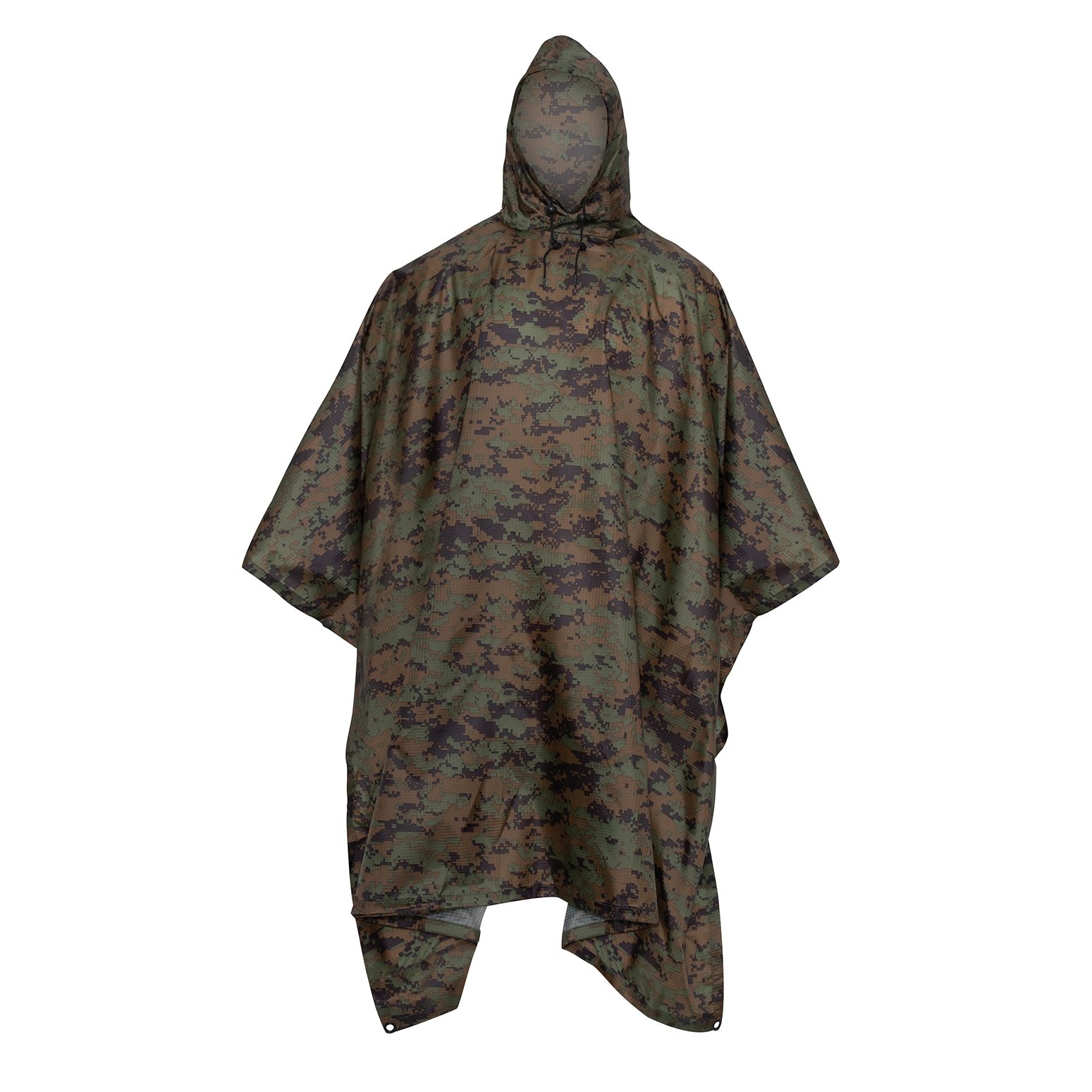 Poncho imperméable à capuche de style militaire. Fermeture à boutons-pression. Les coins sont équipés d'œillets permettant de l'utiliser comme abri d'urgence. Dimensions : 225 x 140 cm, matière : 100 % polyester avec revêtement PU. Plus d'informations