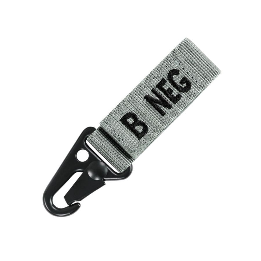 Porte-clés indiquant le groupe sanguin et le facteur RH du porteur. Peut être porté à la ceinture, au PALS, aux clés ou à de nombreux autres objets. Se fixe à l'aide d'une attache métallique de type « crocodile » ou en l'enfilant. Largeur de l'œillet : 5 cm.