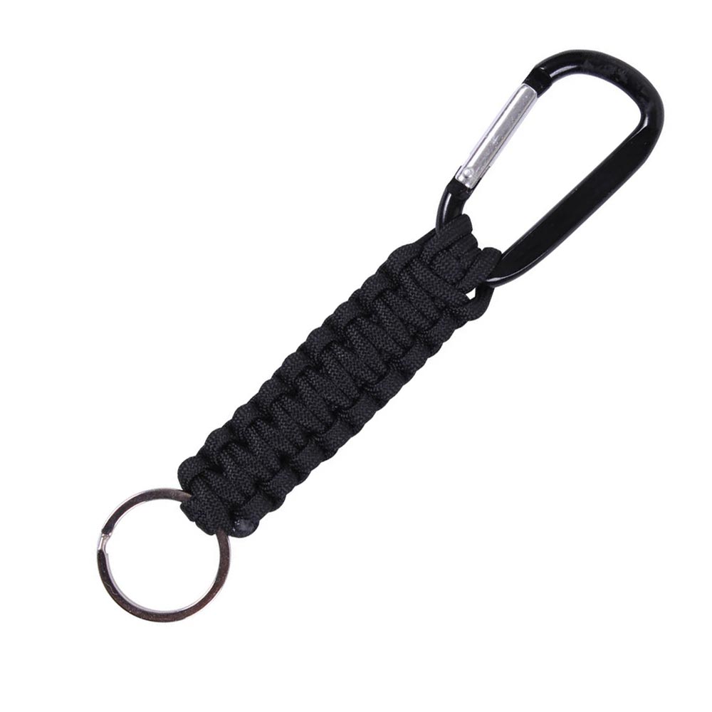 Porte-clés en corde de para avec mousqueton métallique de 6 cm. Longueur 9 cm, largeur 2,3 cm, longueur totale de la corde après dévidage 1,4 m.