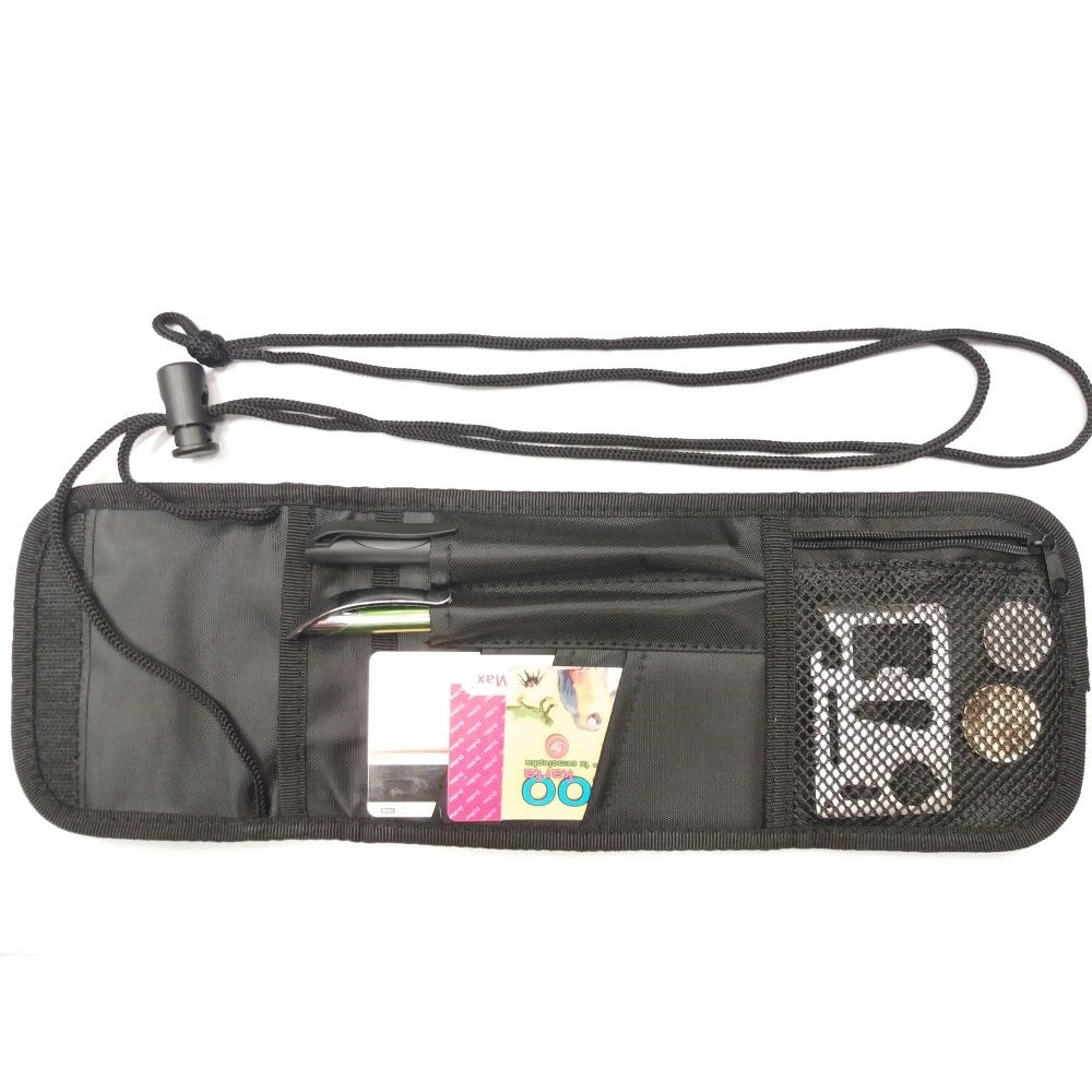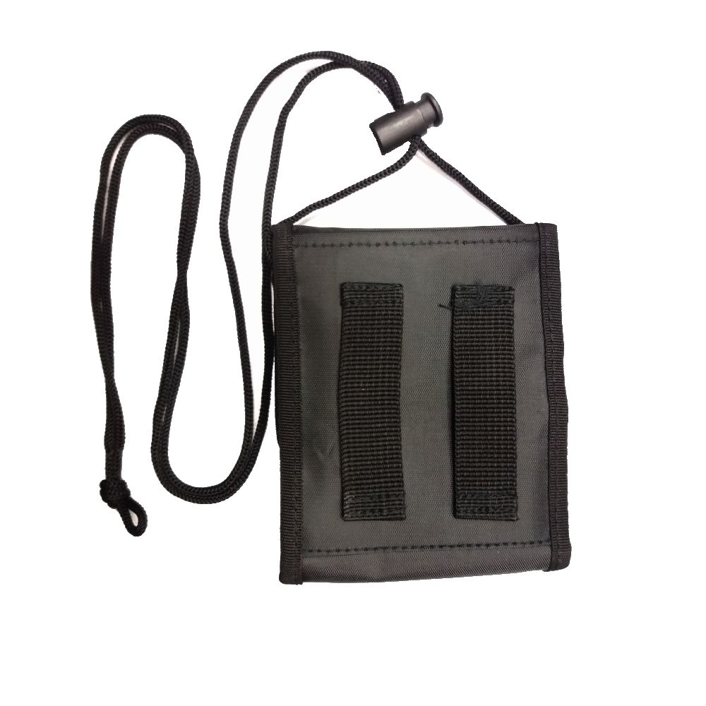 Étui/portefeuille pratique avec cordon pour le porter autour du cou et boucle pour l'attacher à la ceinture. Nombreuses poches intérieures, fermeture à velcro. Dimensions : 13,5 x 11,5 cm (fermé), 33 x 11,5 cm (ouvert). Matériau : 100 % polyamide.
