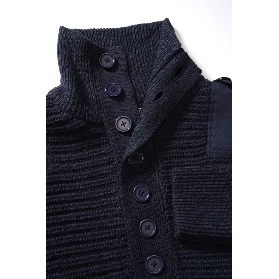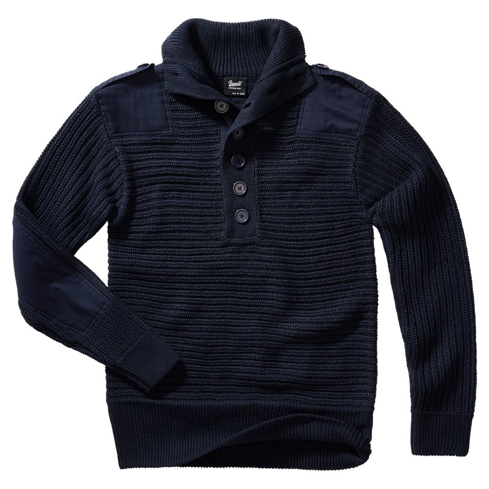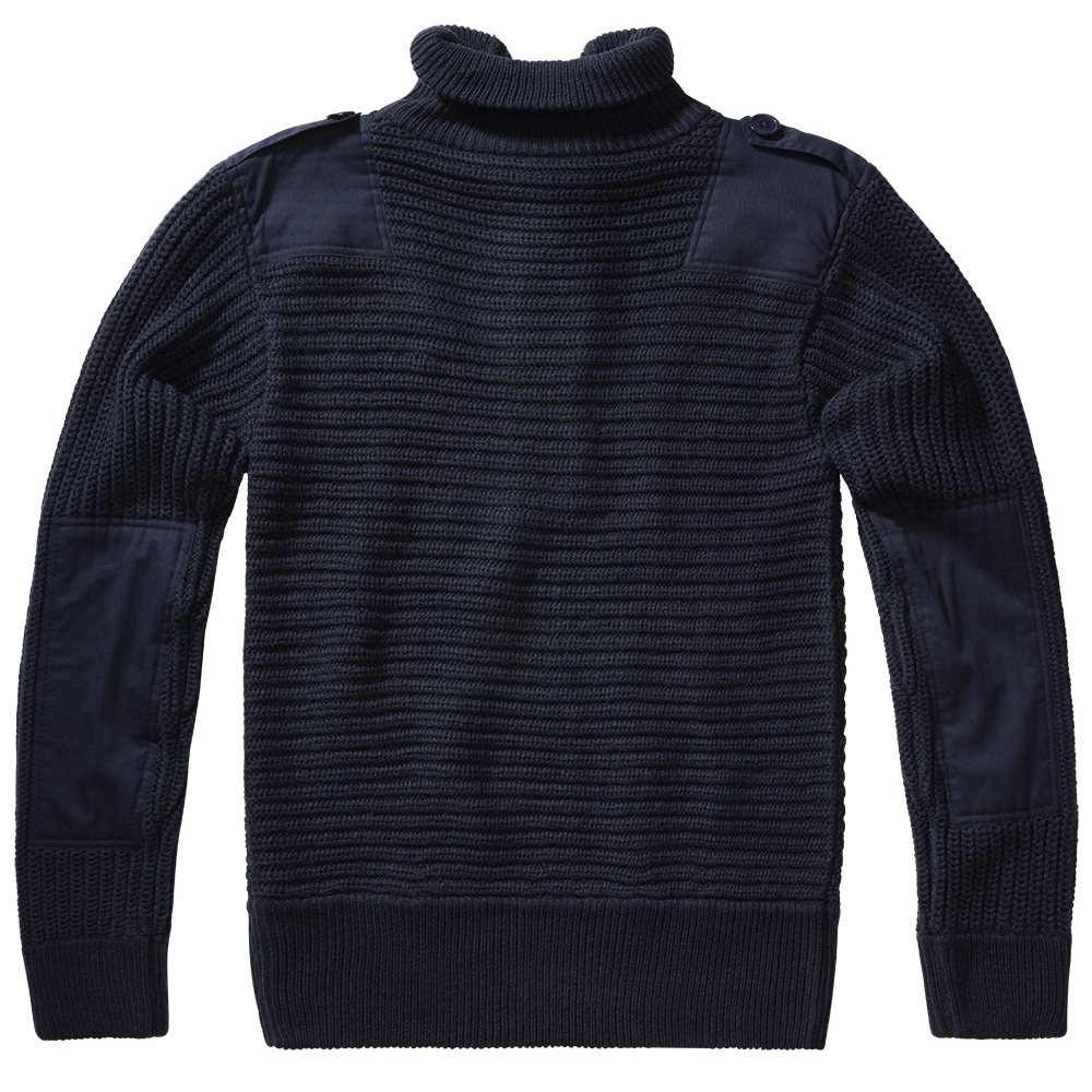 Pull classique tricoté inspiré du style des pulls de l'armée autrichienne. Ce pull est confectionné dans une matière chaude et agréable au toucher, renforcée au niveau des coudes et des épaules pour éviter l'usure. Il est doté d'un col montant, de poignets élastiques et d'épaulettes.