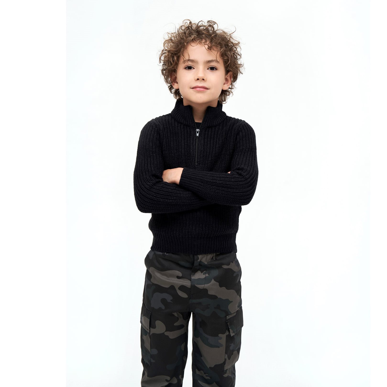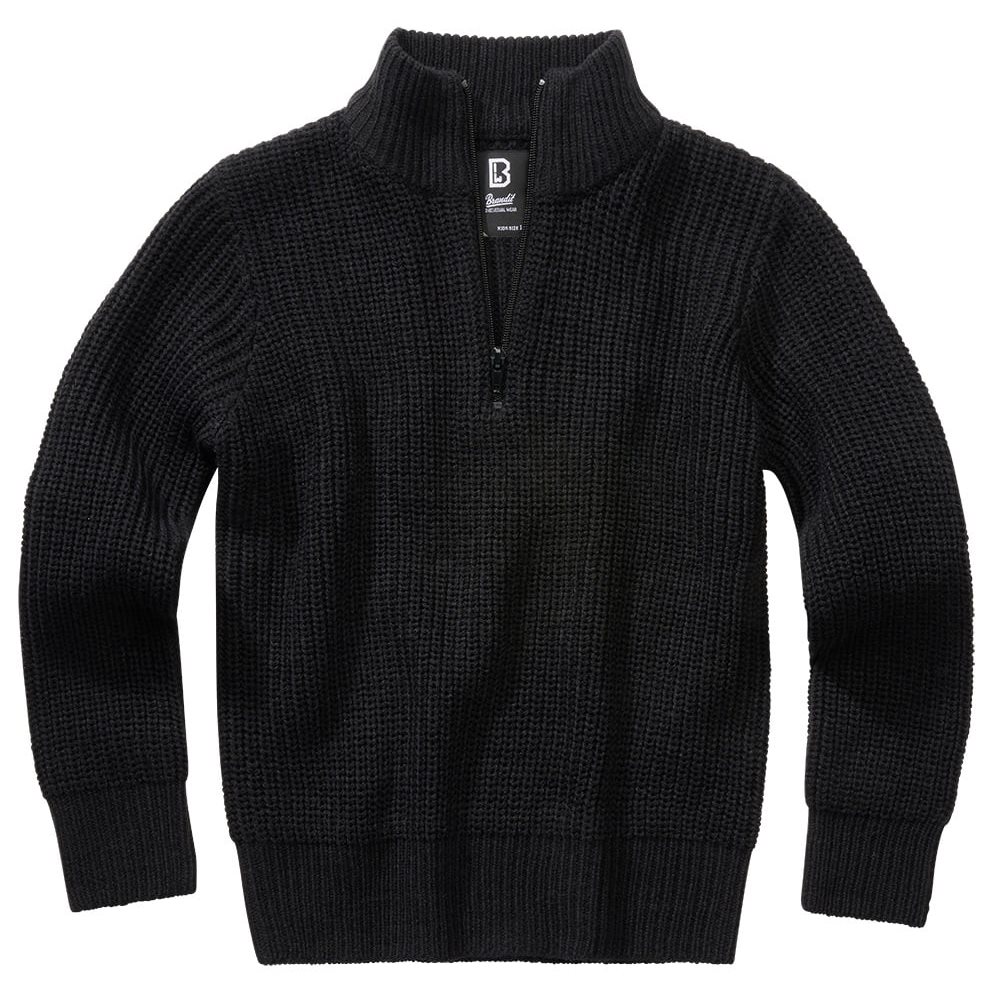 Pull enfant confortable et chaud en maille acrylique. Ce pull présente un tricot en relief au niveau des poignets et de l'ourlet inférieur. Son col rehaussé est particulièrement chaud et se ferme à l'aide d'une fermeture éclair.