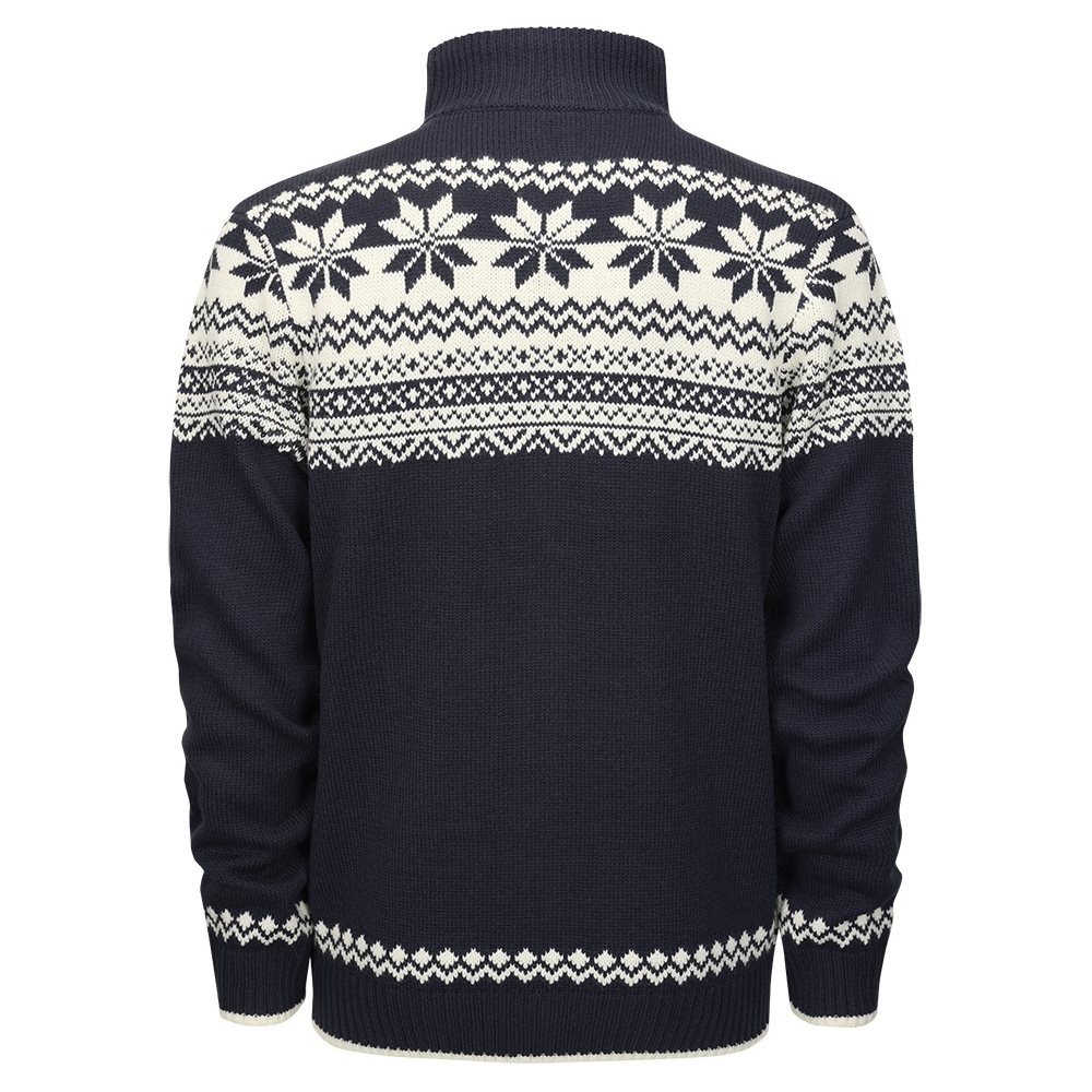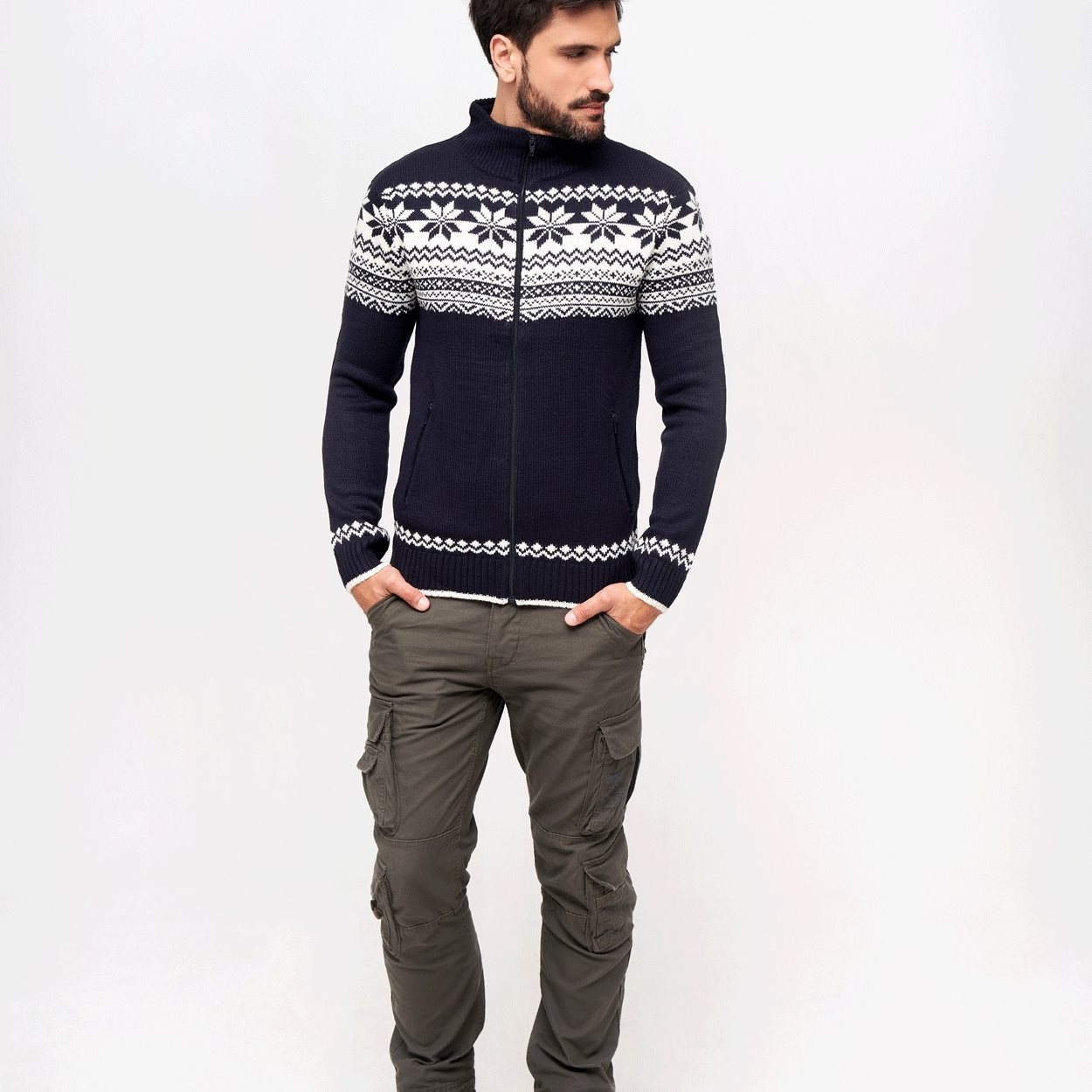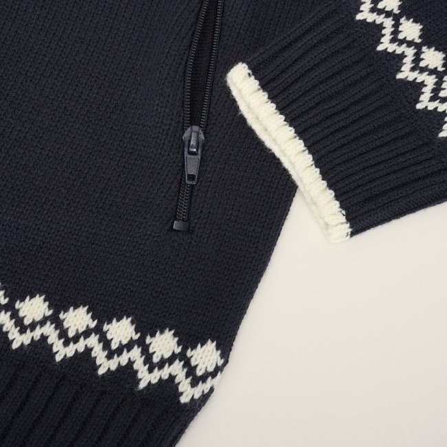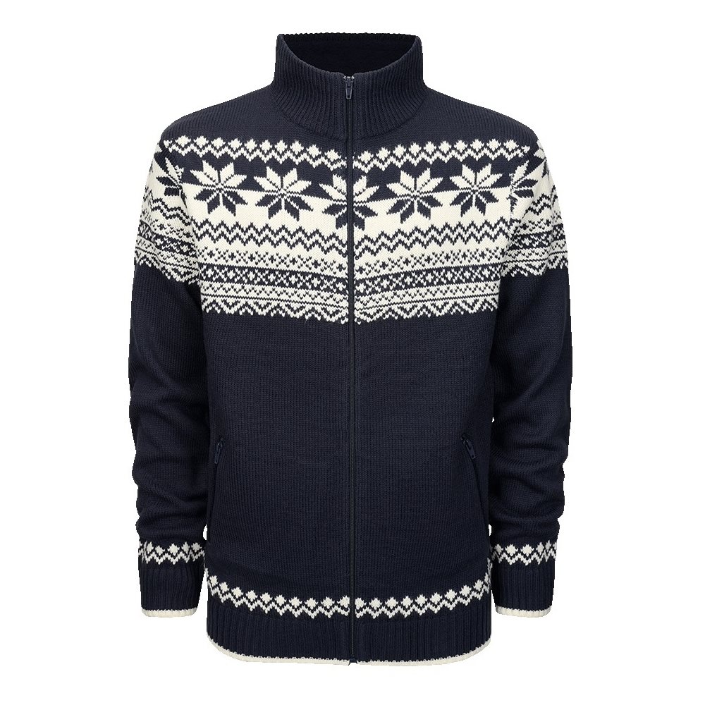 Pull élégant au look scandinave classique. Ce pull est confectionné dans une matière chaude et douce au toucher, avec une doublure en polaire douce au niveau du col. Il se ferme à l'aide d'une longue fermeture éclair métallique. Les poches sont également fermées par une fermeture éclair. Les manches, le bas et le col du pull sont bordés d'un tricot élastique.