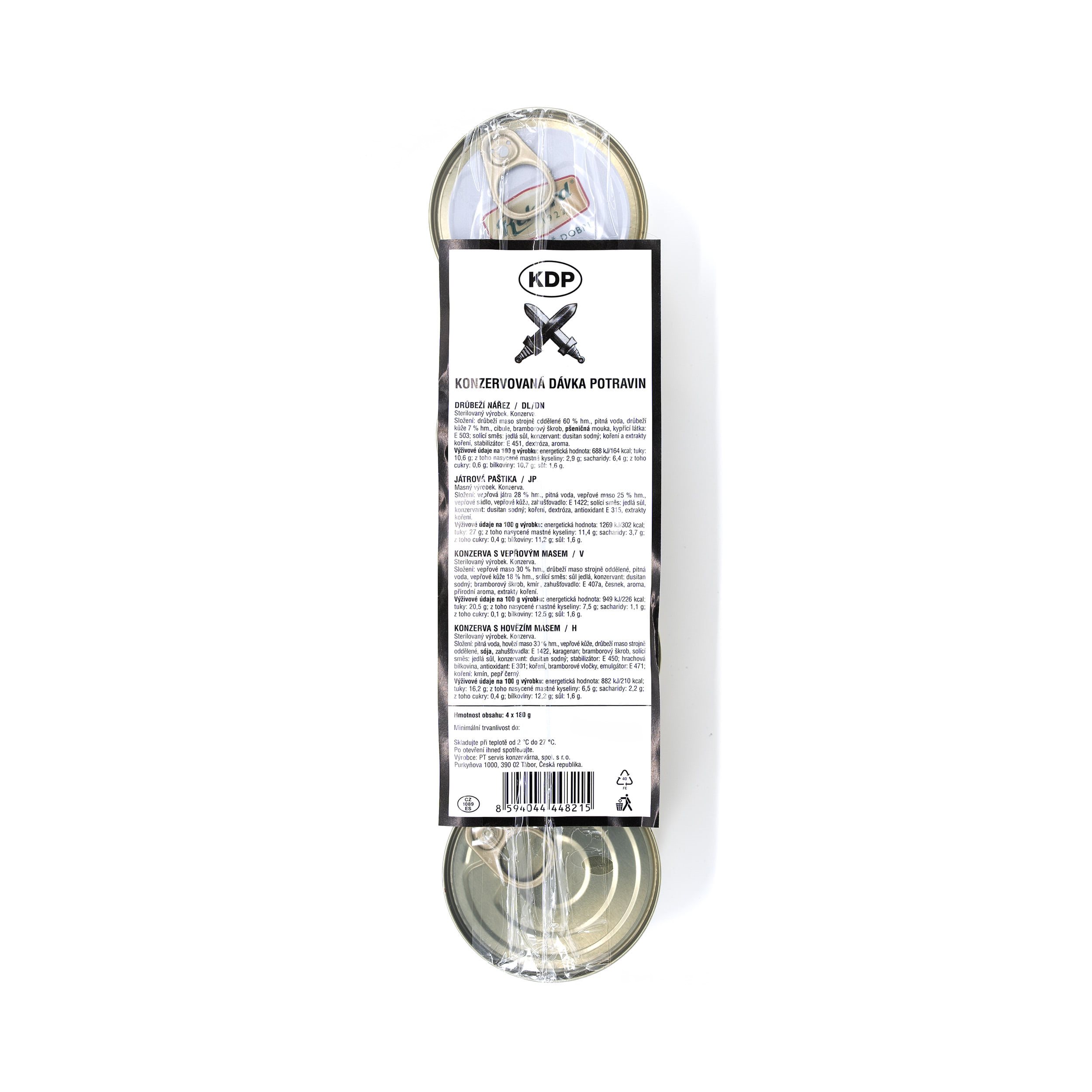 Un classique de l'armée tchèque - ration alimentaire en conserve - KDP. Paquet de quatre conserves de viande différentes.