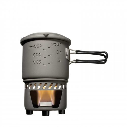 Le réchaud est fabriqué en aluminium extrêmement léger et ses dimensions sont adaptées pour qu'il puisse être facilement rangé dans une casserole lors du transport, afin de gagner de la place. Au fond du réchaud se trouve une petite coupelle qui peut contenir en toute sécurité un cube d'alcool à brûler solide. Le réchaud est livré avec un étui de transport pour la tasse avec couvercle et un étui séparé pour le réchaud. Les deux étuis se ferment à l'aide d'un cordon avec curseur en plastique.