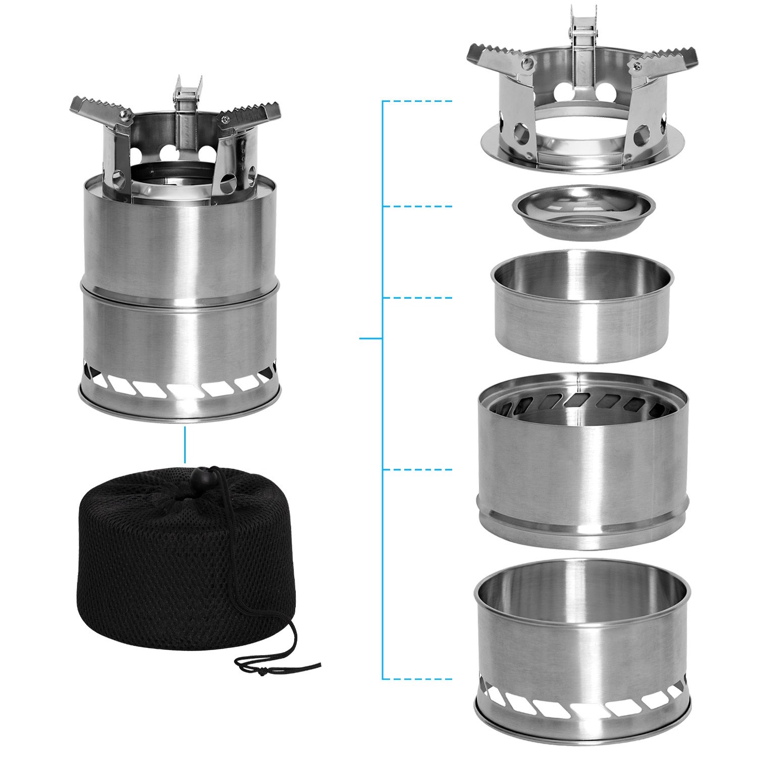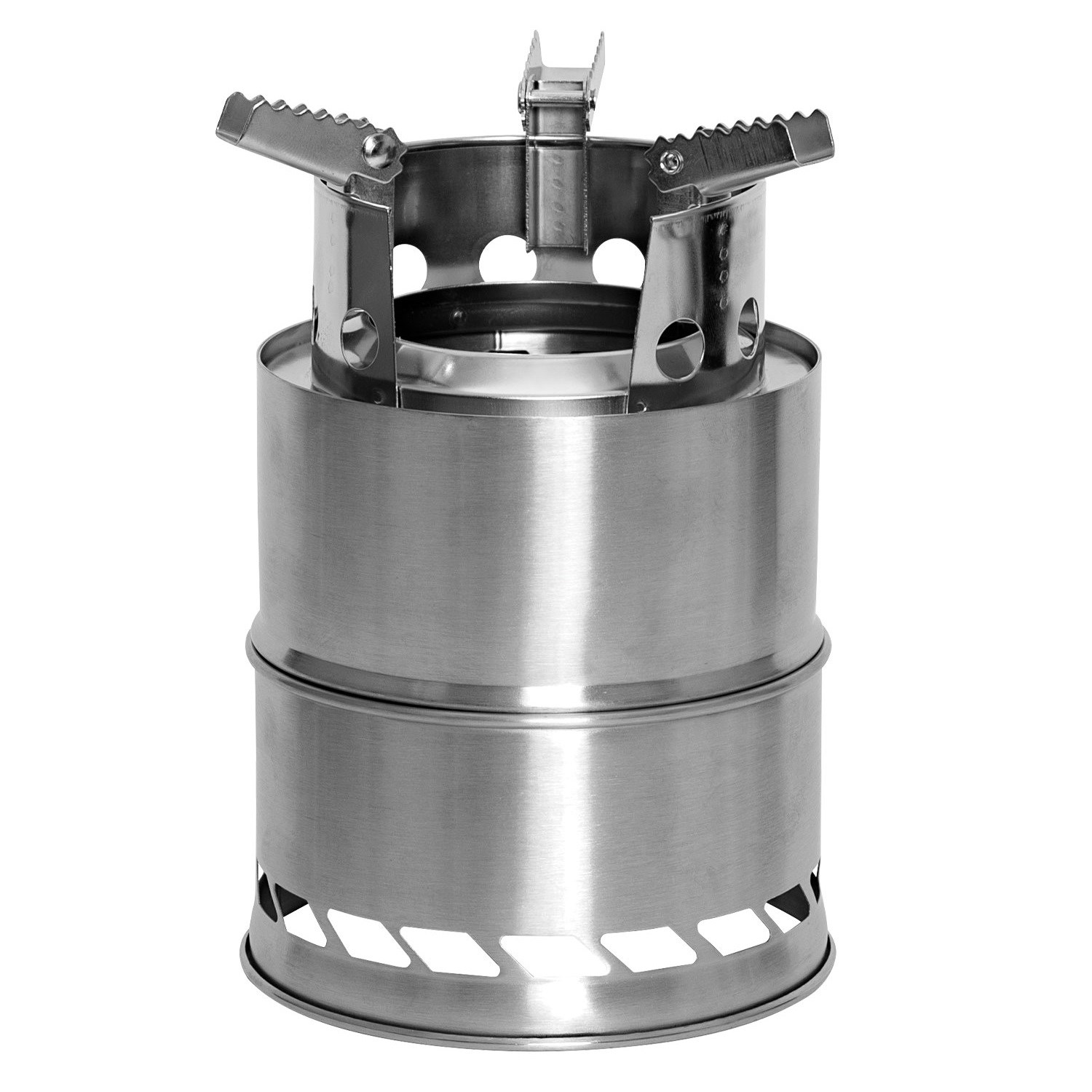 Réchaud pratique pour combustibles liquides et solides. Le tout est facilement rangé dans un étui en tissu. Le paquet comprend également une paille télescopique de 48 cm de long, qui sert à attiser le feu sous le réchaud en toute sécurité. Le réchaud est équipé de trois pieds rabattables dentelés. Le réchaud est équipé de trois pieds rabattables à dentelures. Pour l'utilisation d'alcool solide ou liquide, le kit comprend un petit bol que vous placerez sur le tamis perforé.