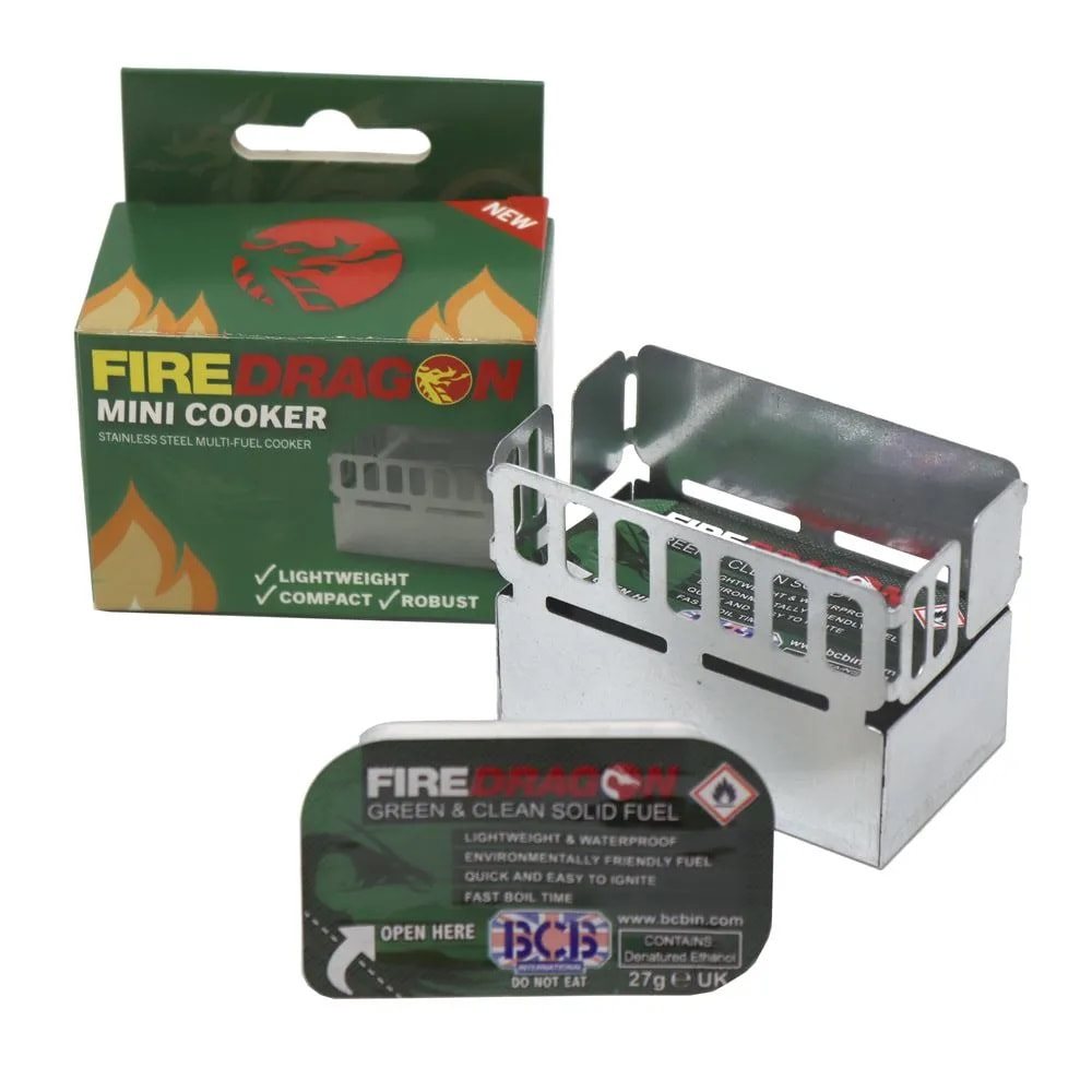 Réchaud compact en acier inoxydable. Il est principalement conçu pour les pastilles combustibles FireDragon, mais il peut également être utilisé avec d'autres combustibles solides, des gels et certains combustibles liquides (il n'est toutefois pas conçu pour être utilisé avec de l'essence). La partie supérieure du réchaud est partiellement perforée pour améliorer l'apport d'air.