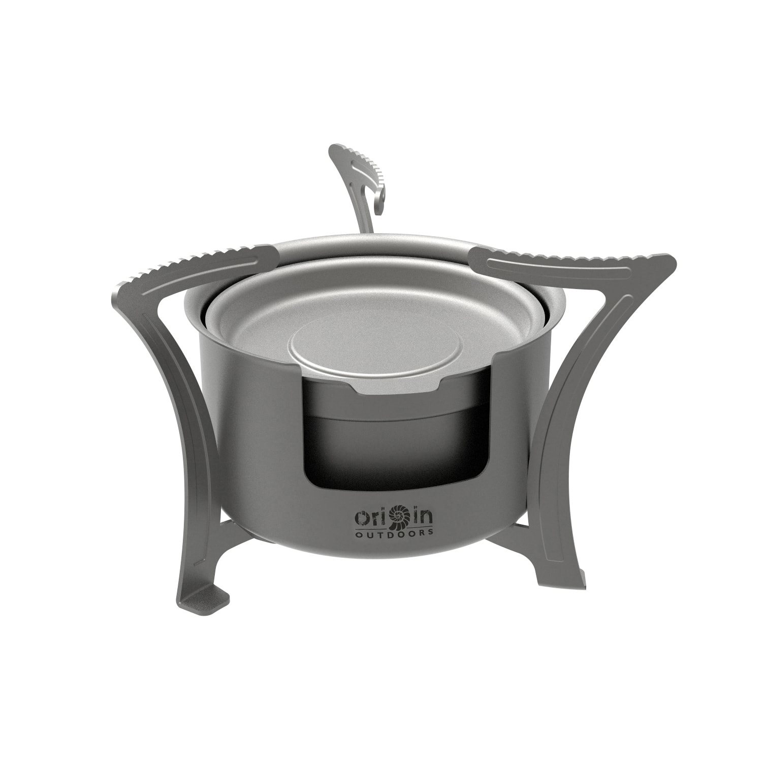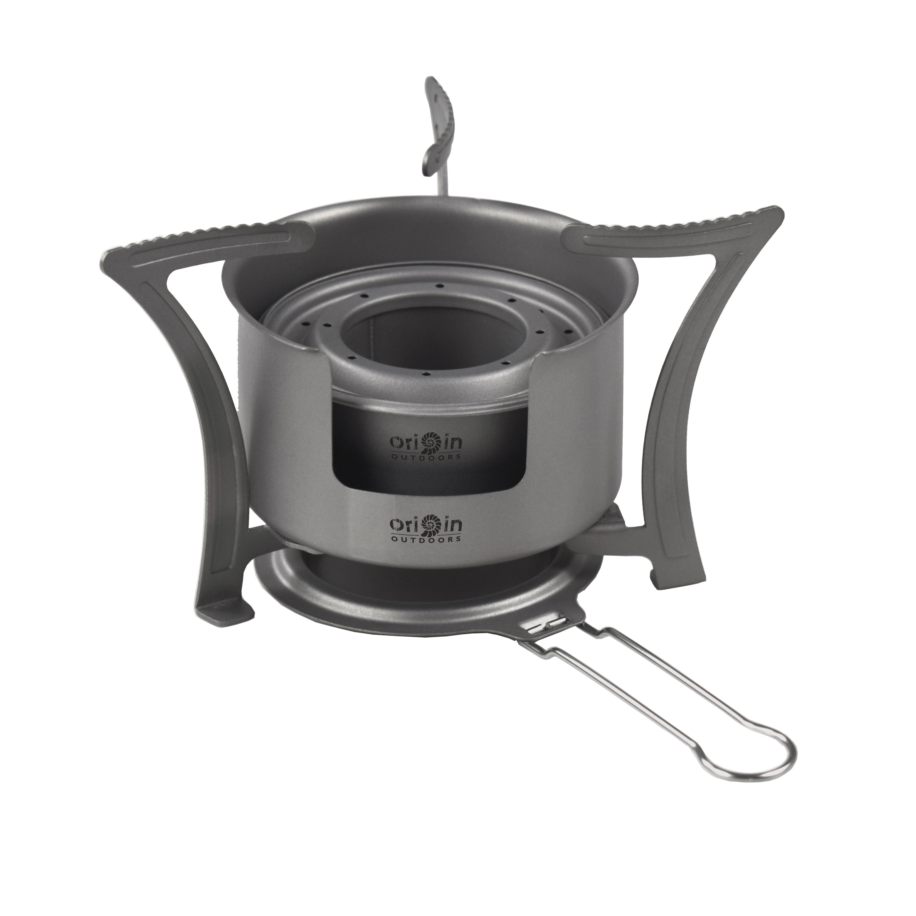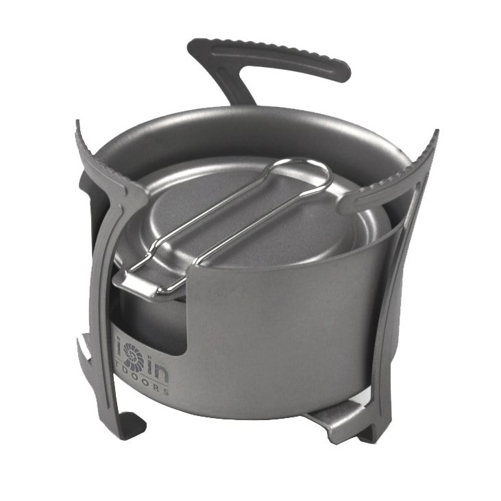 Réchaud d'extérieur ultra léger en titane avec surface sablée. Grâce à son insert amovible, il peut être utilisé aussi bien avec du combustible solide que liquide. Les pieds du réchaud sont pliables. Poids du kit : 106 g. Plus d'informations