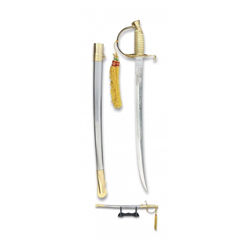 Sabre d'une longueur de 50 cm. Livré avec un fourreau en fer et un support en bois. Plus d'informations