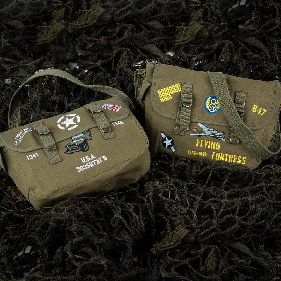 Sac de transport à bandoulette orné d'une illustration du bombardier stratégique B-17 FLYING FORTRESS. Il est fabriqué en toile de coton robuste. Pour un transport confortable, le sac est équipé d'une bandoulette réglable en longueur. Sur les côtés, vous trouverez de petites poches pour les petits objets, qui peuvent être fermées en toute sécurité à l'aide d'un rabat à bouton-pression. L'accès au compartiment principal est également fermé par un rabat sécurisé.