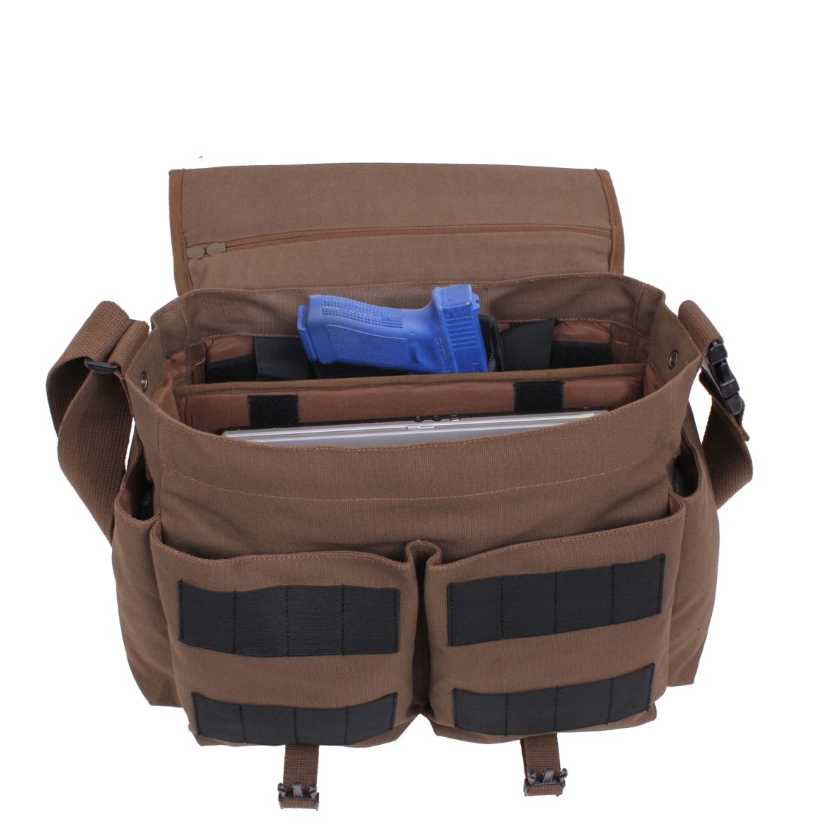 Le Concealed Carry Messenger est un sac en toile simple doté d'une poche permettant de transporter une arme de manière dissimulée. Le compartiment principal du sac est divisé en deux parties par une cloison rigide. La plus petite partie est en partie recouverte de velcro, ce qui vous permet d'y fixer des étuis à arme compatibles VELCRO. Vous trouverez également à l'intérieur deux sangles élastiques qui servent à fixer les chargeurs du pistolet. L'arme rangée est accessible de l'extérieur par les fermetures éclair supérieures ou latérales. La plus grande partie du compartiment principal est vide, ce qui convient au transport d'ordinateurs portables jusqu'à 14 pouces. À l'avant du sac, vous trouverez deux poches fermées par un aimant. Elles sont recouvertes d'une bande MOLLE/PALS. Sur les côtés du sac, vous trouverez deux poches destinées au transport de bouteilles.