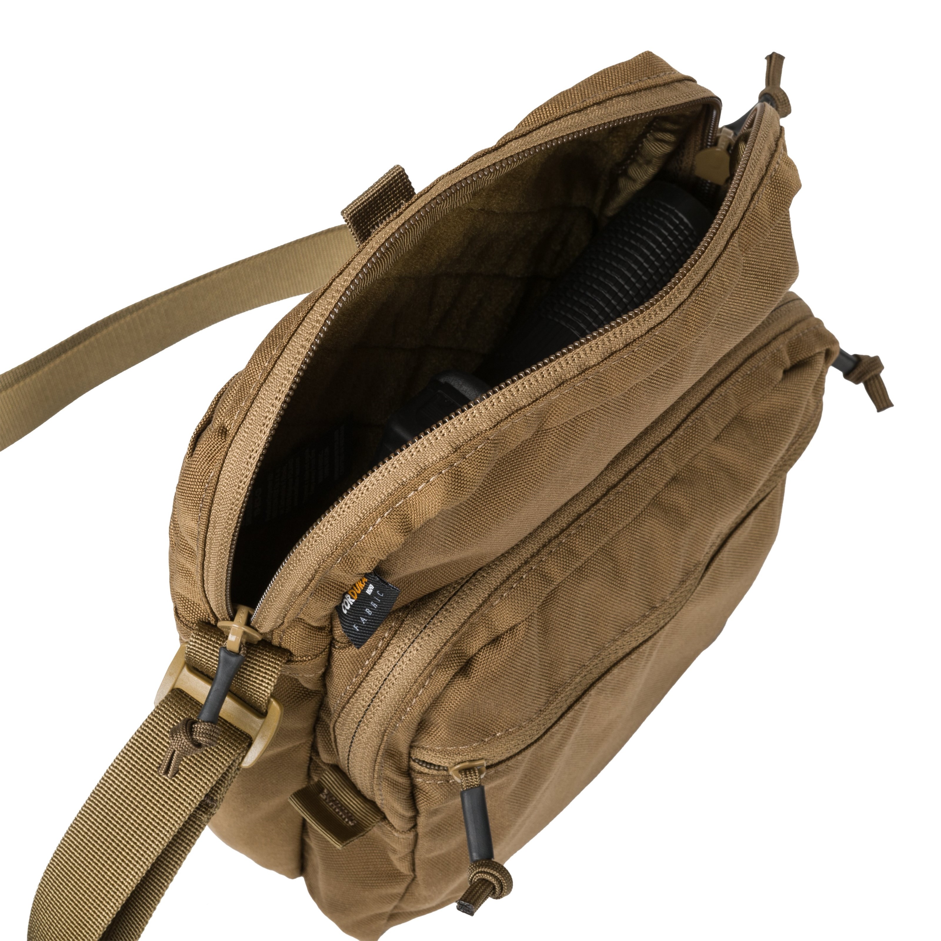 La bandoulière du sac mesure 25 mm de large et est réglable en longueur. À l'avant du sac, vous trouverez une poche divisée en deux compartiments accessibles par des fermetures éclair YKK. Le compartiment avant est plat, destiné au transport de petits objets, tandis que le second, plus grand, est équipé d'un grand organiseur. Le compartiment principal du sac est accessible par une fermeture éclair à double sens. Son intérieur est recouvert d'un molleton doux, ce qui permet d'y insérer sans difficulté des inserts compatibles et des étuis pour armes de service. La poche arrière du sac est plate et se ferme par velcro.