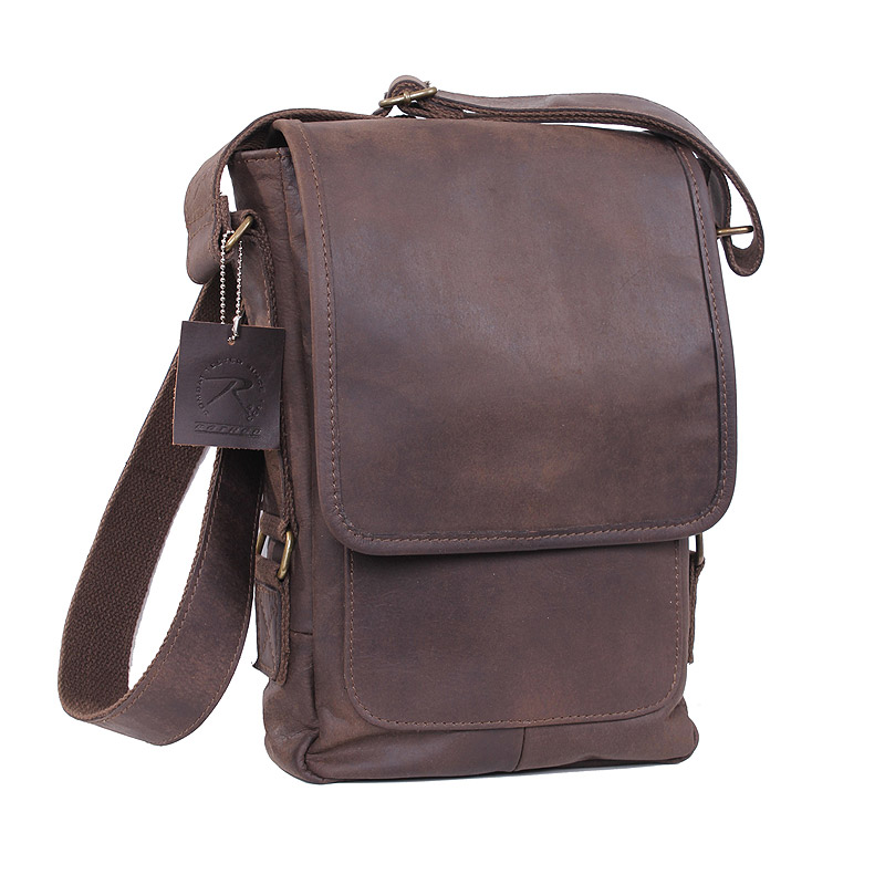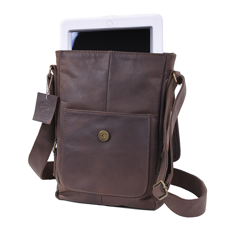 Sac à bandoulière entièrement en cuir avec doublure en toile, dont les dimensions intérieures conviennent pour une tablette ou un petit ordinateur portable.