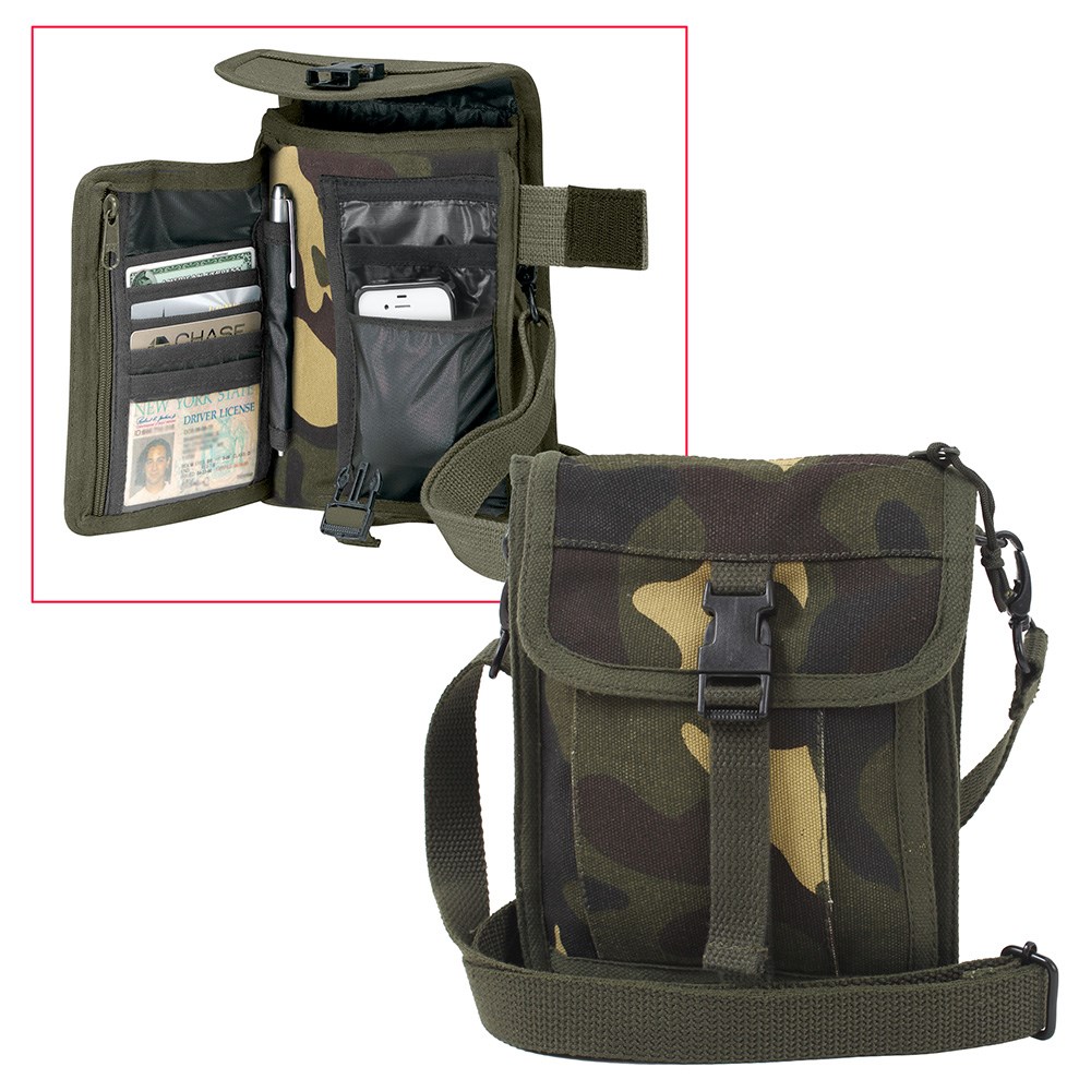 Sac en toile à bandoulette avec de nombreux compartiments et poches.