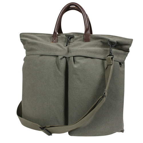 Sac en toile pour casque avec bandoulière réglable et deux poches extérieures. Poignées en cuir et fermeture éclair en laiton.