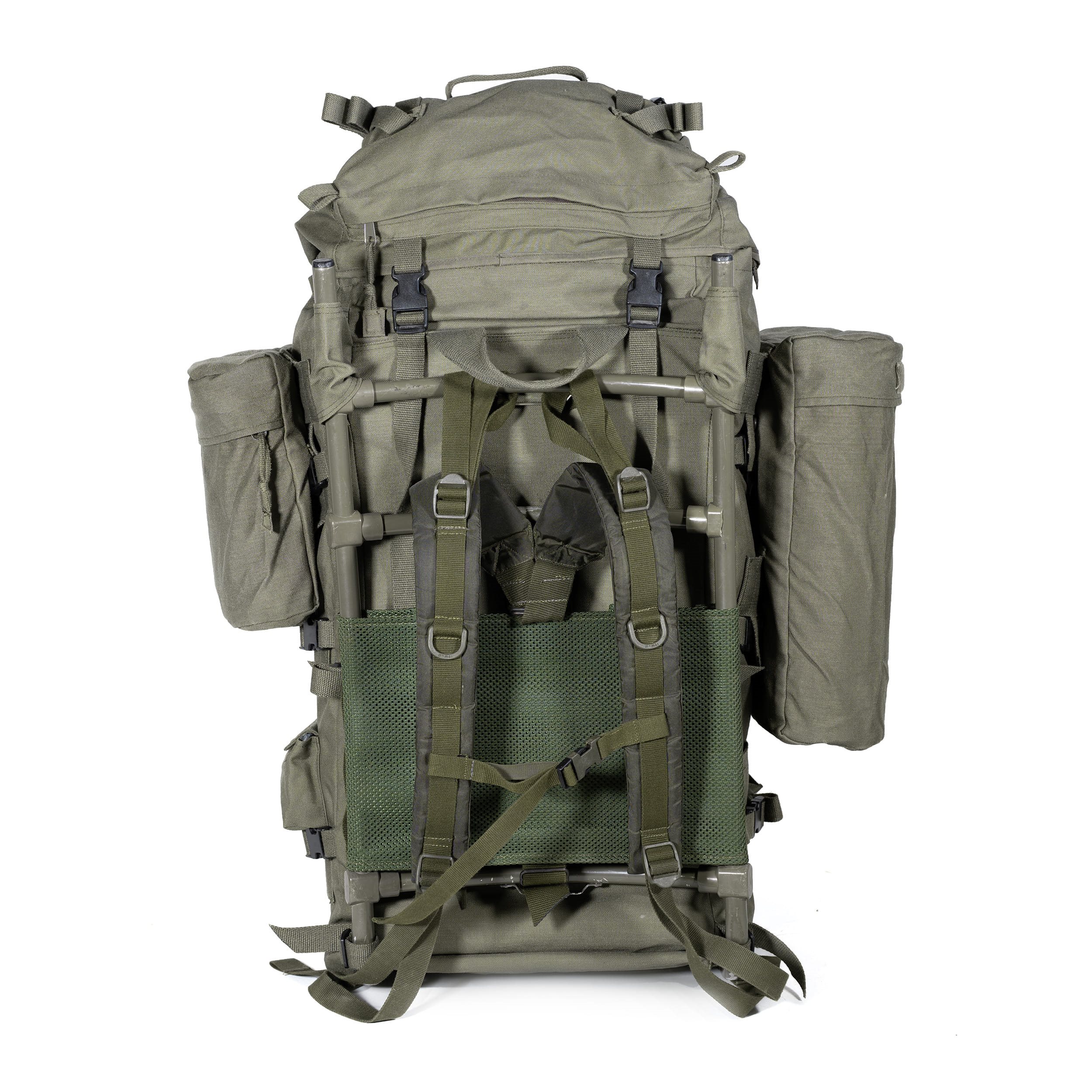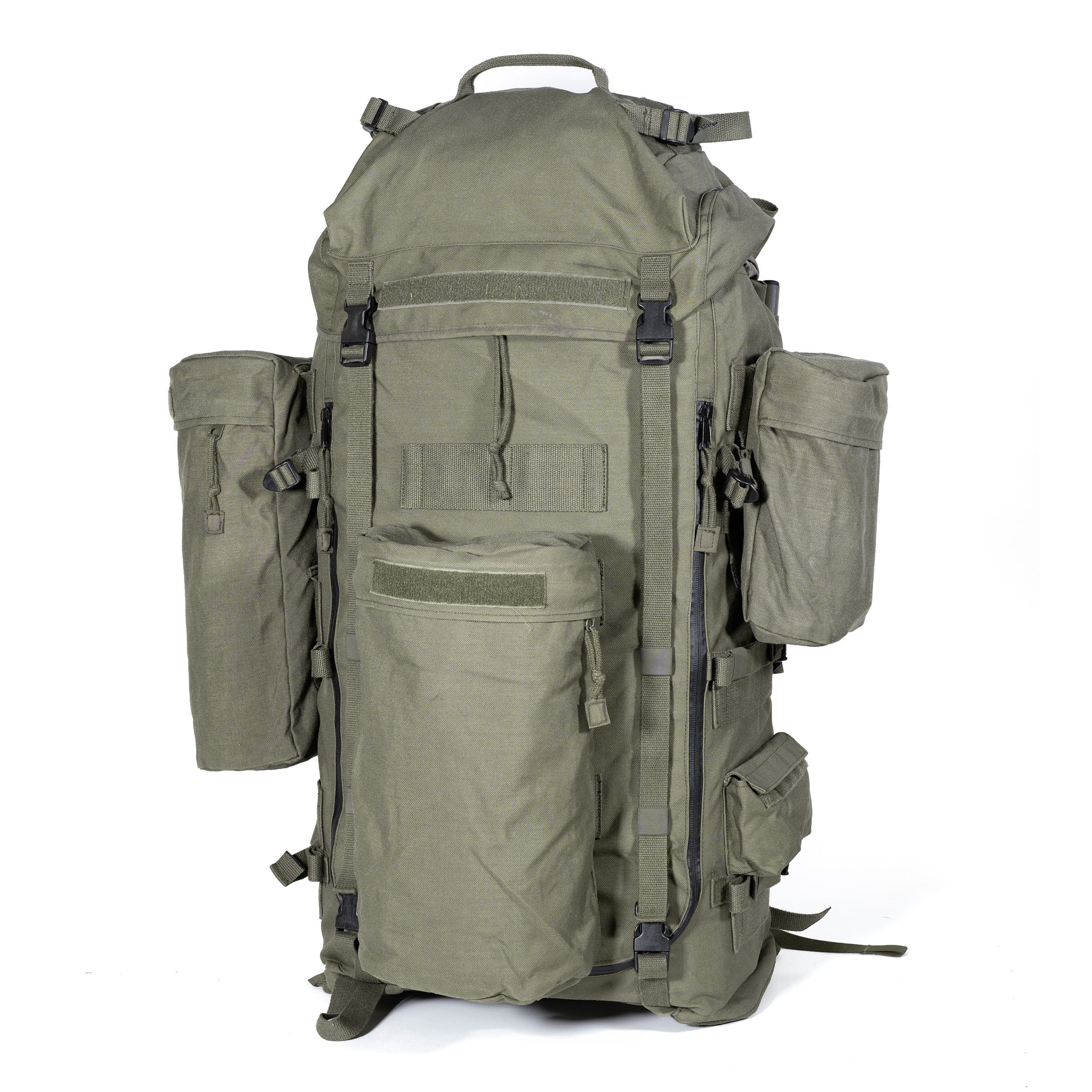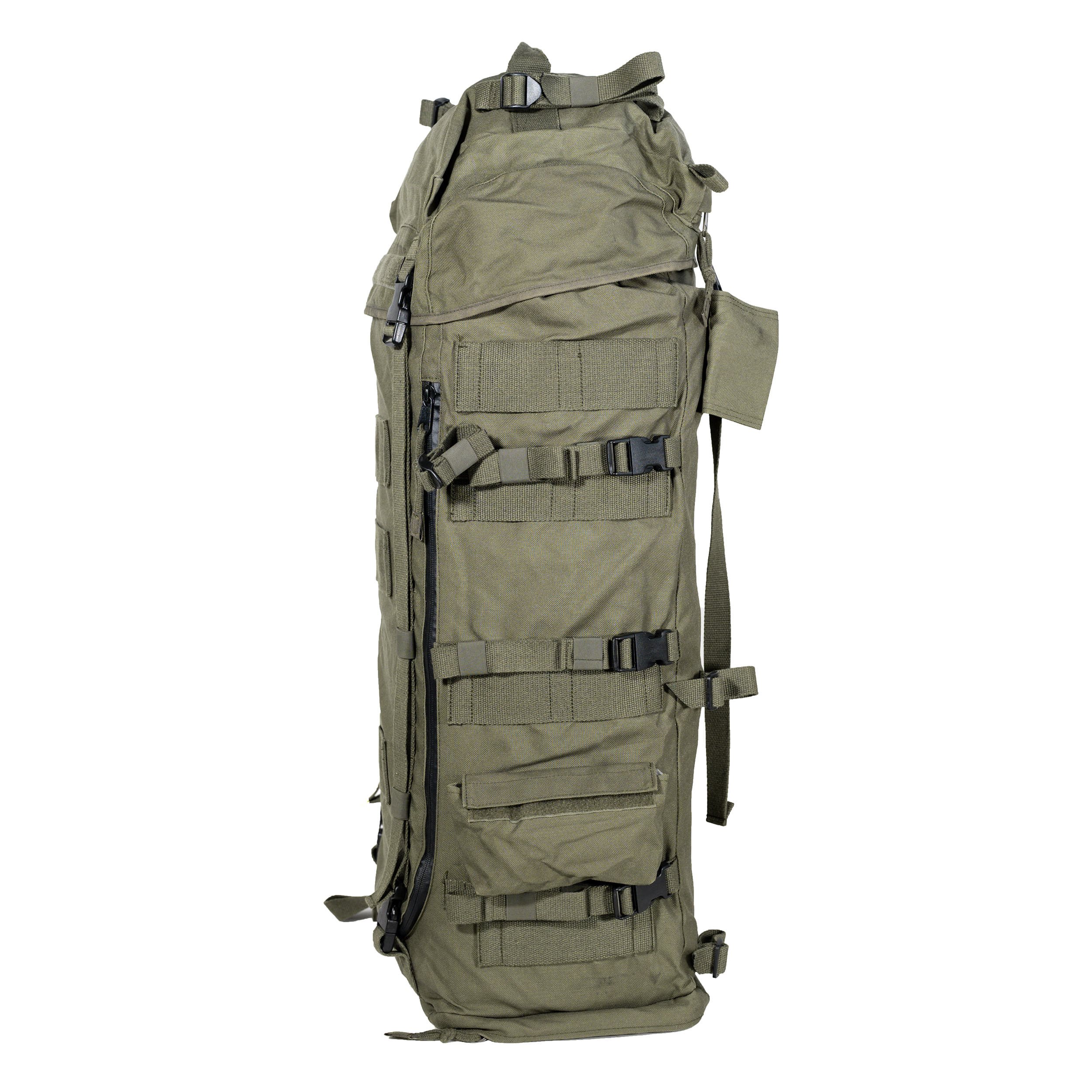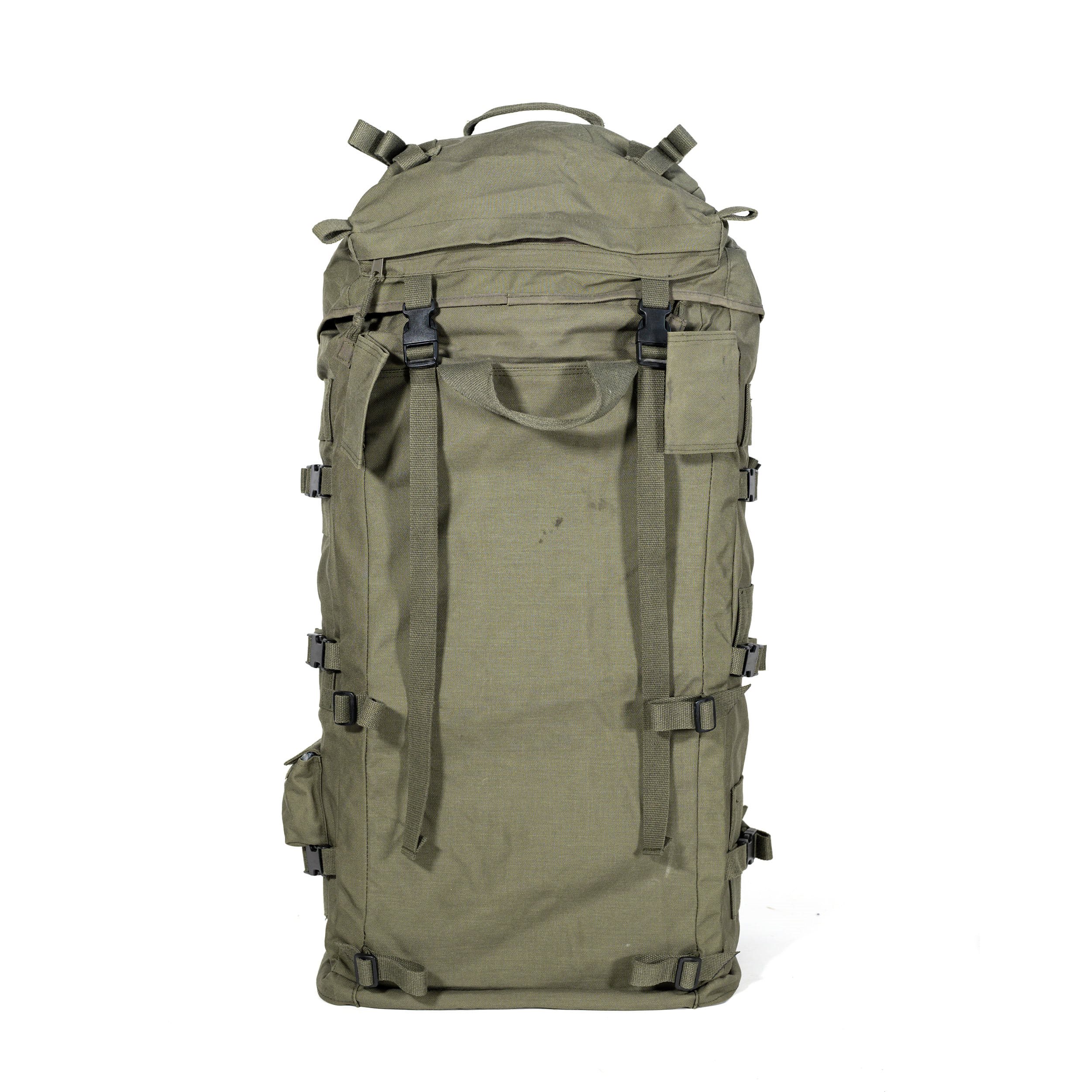 Sac à dos militaire d'origine sans structure dorsale. D'une capacité de 90 litres, le sac à dos est équipé d'une série de sangles de compression et l'ouverture supérieure est conçue comme une manche classique à double serrage. Plus d'informations