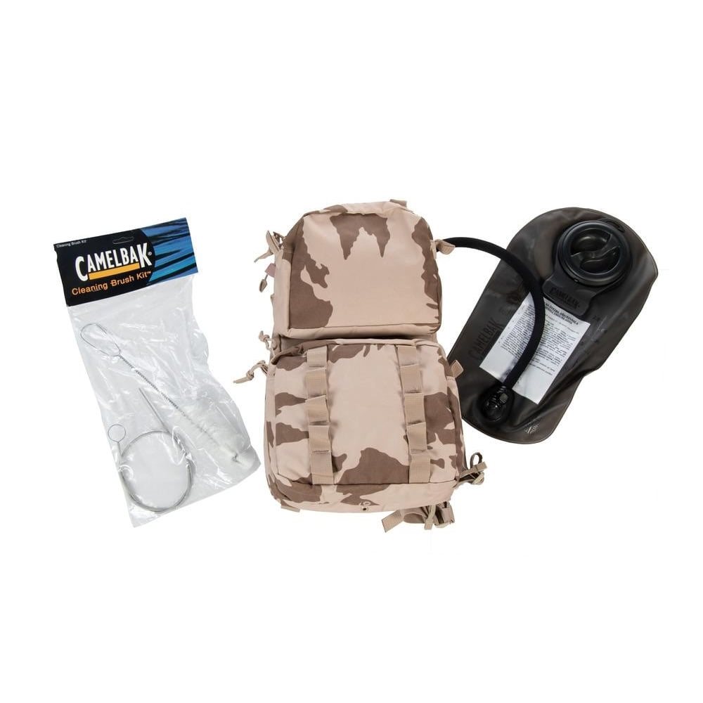 Petit sac à dos beige imprimé motif 95. Comprend une poche à eau CAMELBAK d'une contenance de 3 litres. Sans la poche à eau, il peut servir de sac à dos compact pour une journée. Produit neuf en stock.