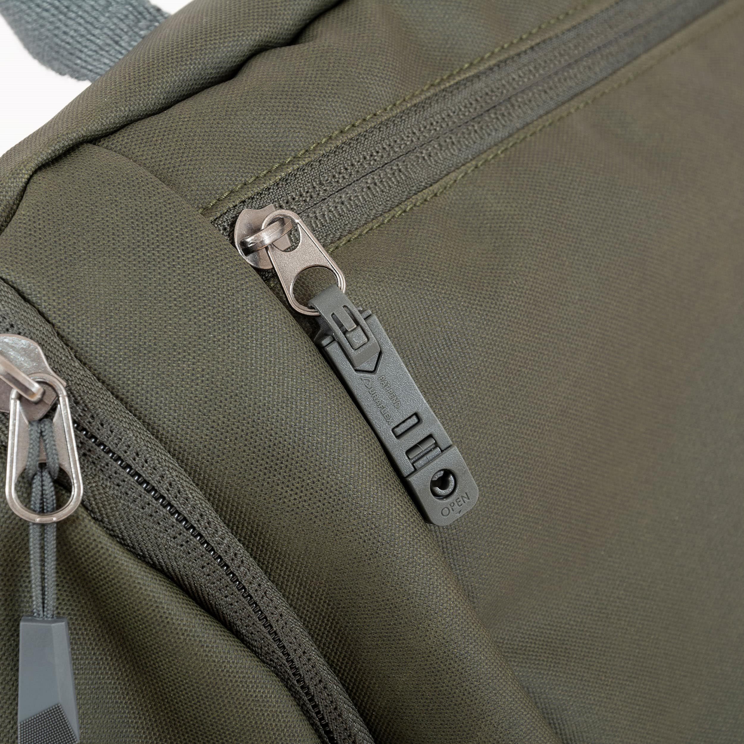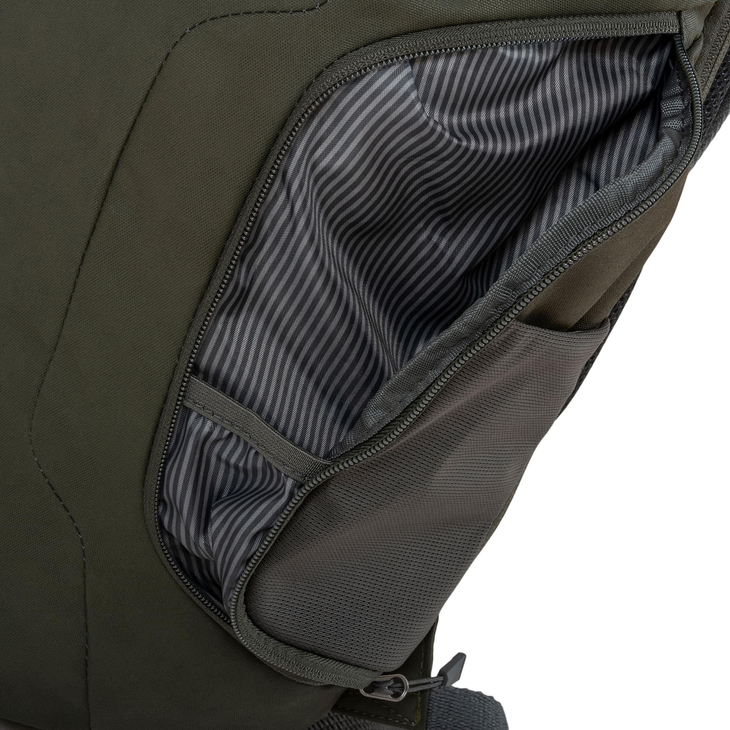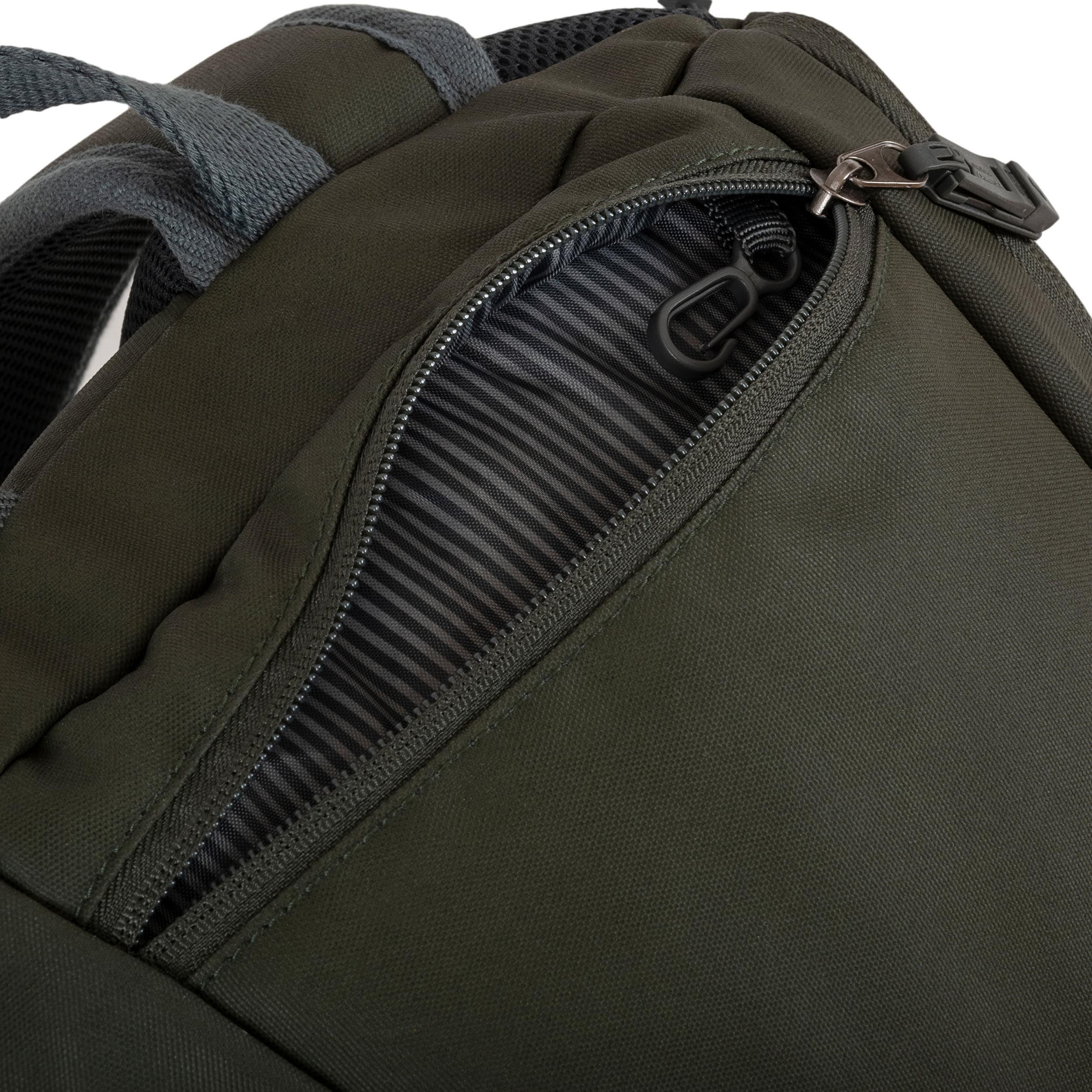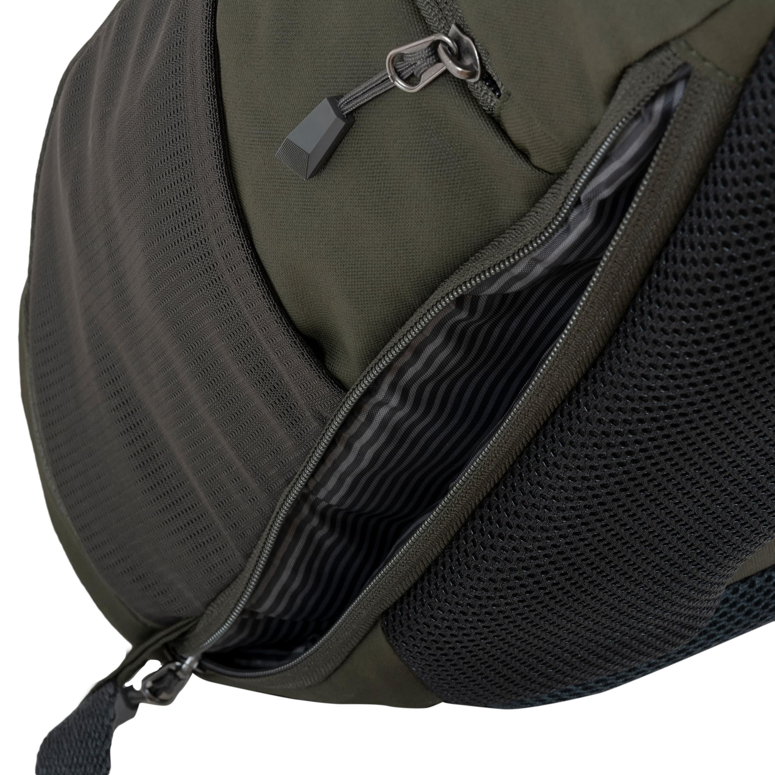 Les bretelles sont légèrement incurvées, réglables en hauteur et assez rembourrées. Le dos est généreusement rembourré avec une maille 3D respirante. Au-dessus des bretelles, vous trouverez une poignée en tissu simple qui facilite le transport. Sur les côtés, vous trouverez des poches accessibles par une fermeture éclair à sens unique. Elles sont équipées d'une boucle à l'intérieur et d'une poche élastique à l'extérieur destinée au transport de bouteilles. Sur le côté gauche, derrière la sangle de transport, se trouve une poche cachée destinée au transport d'un ordinateur portable ou d'une tablette. La partie avant du sac à dos n'est pas compartimentée. Le rabat s'ouvre à l'aide d'une fermeture éclair à double sens et dispose d'une petite poche plate. L'espace de rangement principal n'est pas compartimenté.